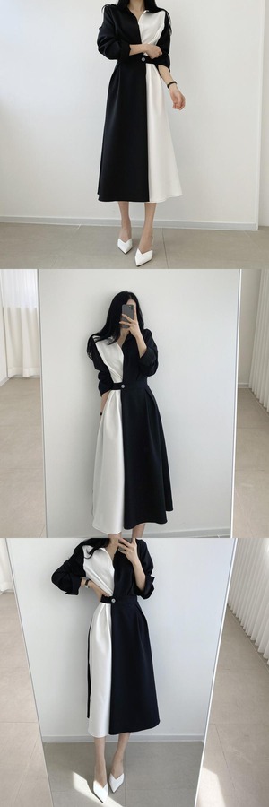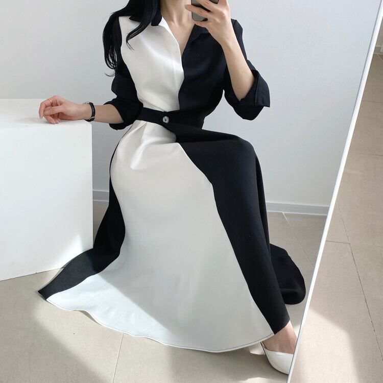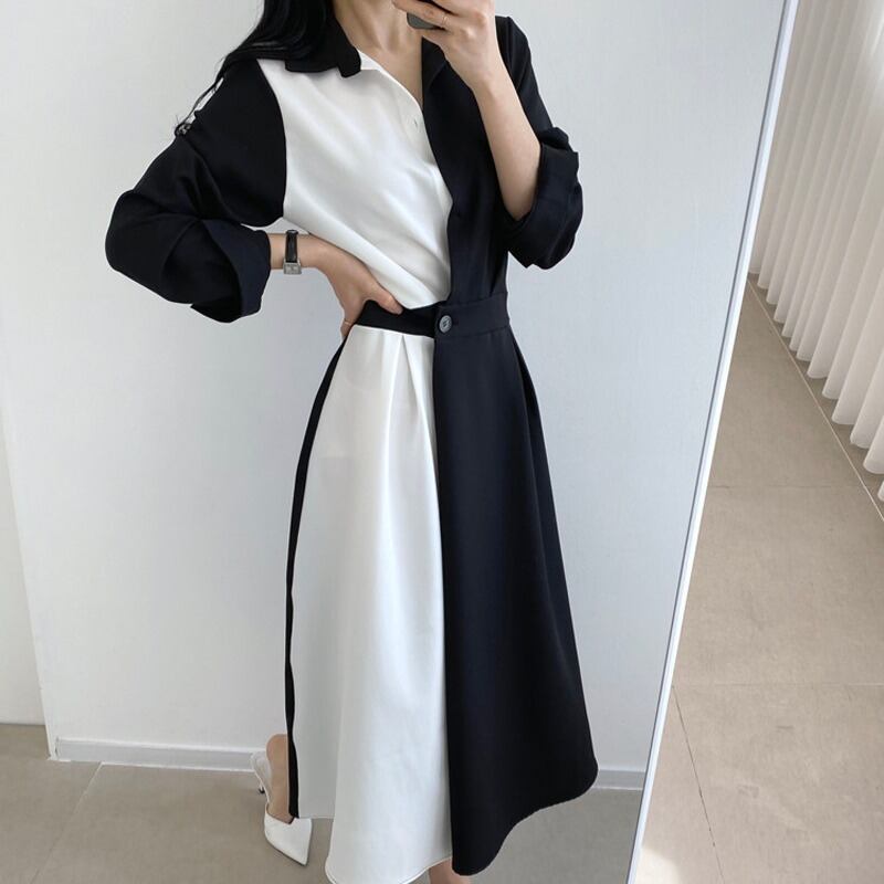 サマースタンダードカラーウェストシャツ ドレス ロングスカート レトロ 夏物 韓国婦人78006775823