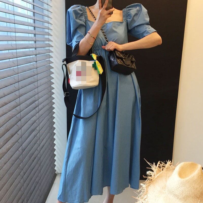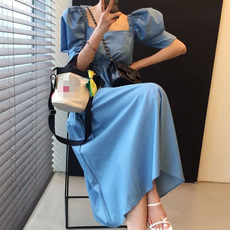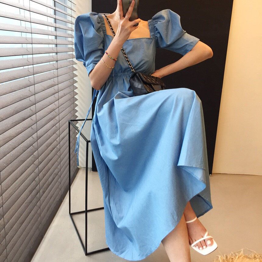 サマーカラーウェストサイドロングドレス レディース 夏物 スクウェア 韓国婦人31378983919