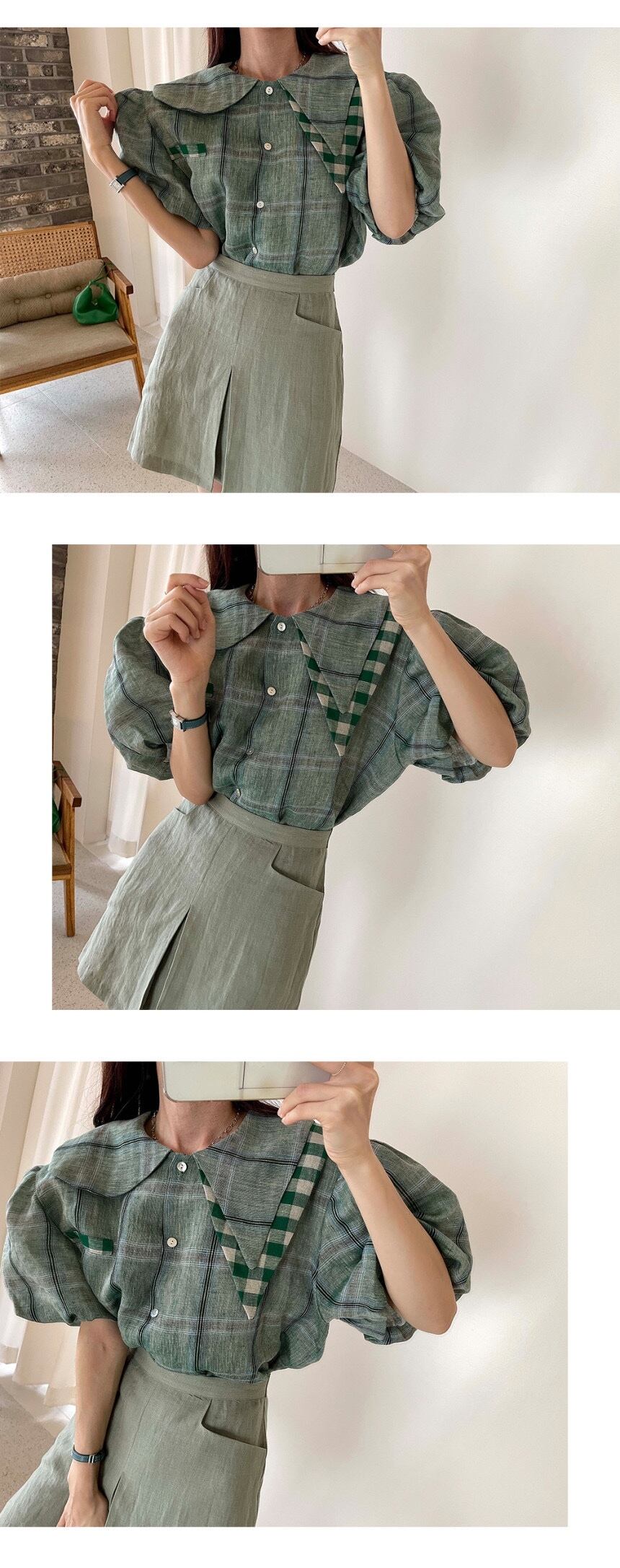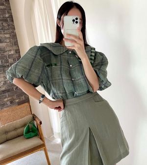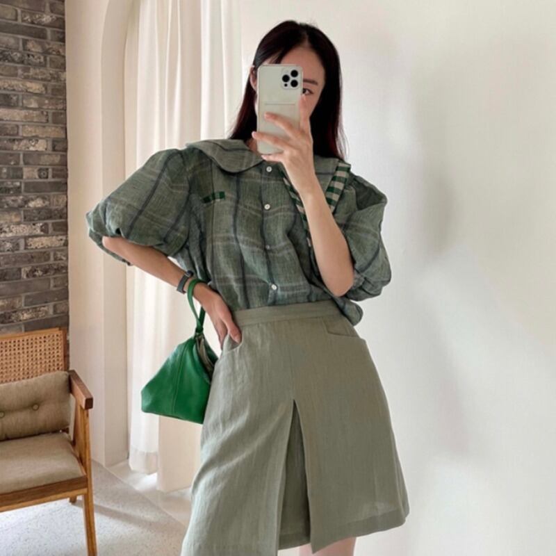 サマーカラースリーブ格子柄シャツ ハイウェストウェストAラインスカート 夏物 韓国婦人54789901884
