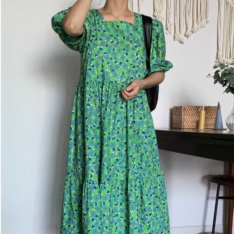 カラースタンダードフローラルスリーブルーズドレス サマーロングスカート レトロ ストリート 大人ガーリー スウィート キュート カジュアル 夏物 花柄 スクウェア 韓国婦人95351079830
