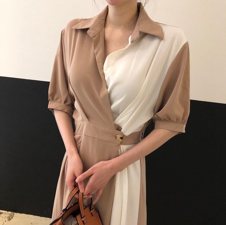 サマースタイルカラーボタンウェストシャツ ドレス ロングスカート 夏物 ステッチ 韓国婦人64303419853