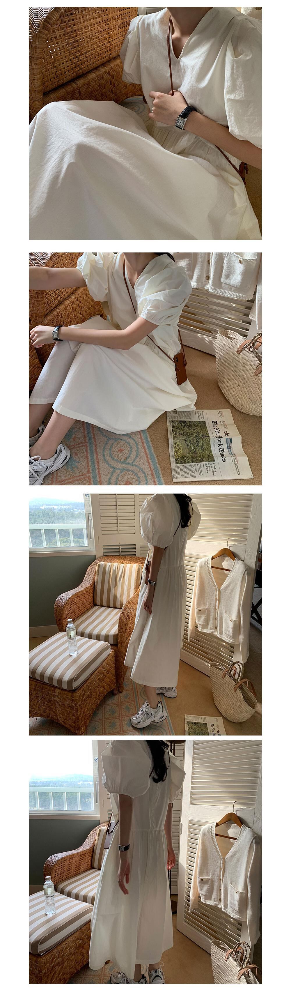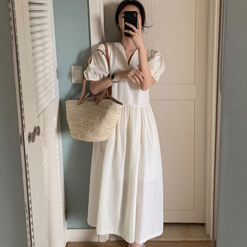 サマースタンダードスリーブVネックルーズドレス レトロ 夏物 韓国婦人23895983397