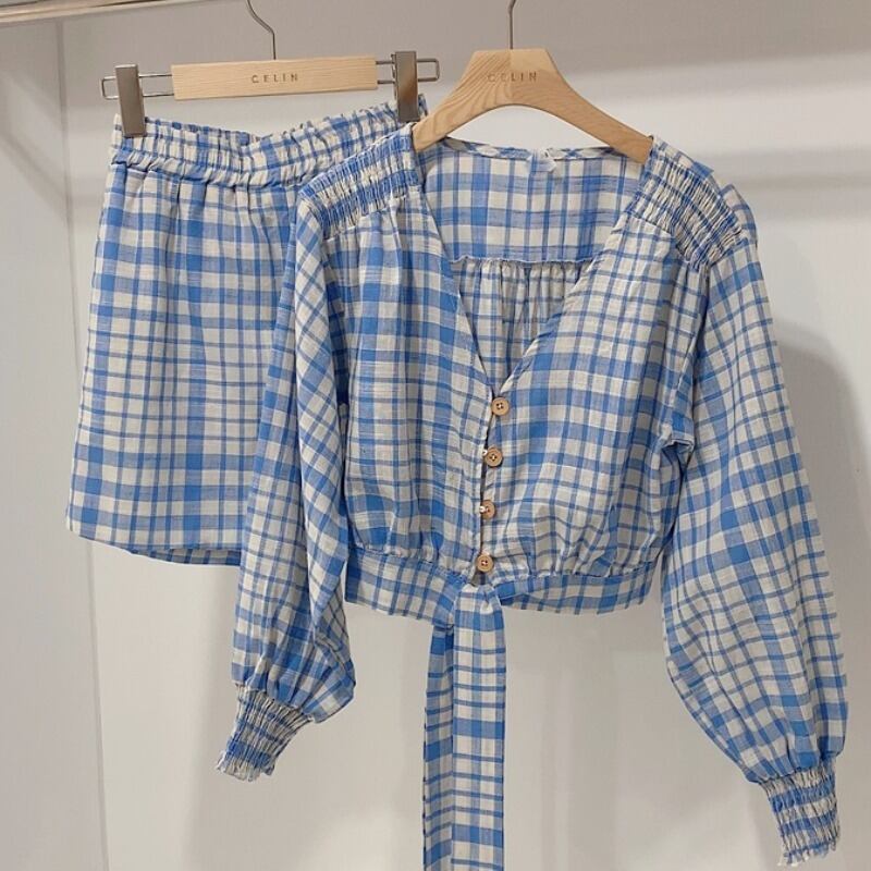 スタンダードVネックシャツ ハイウェストウェストカジュアルショーツ レトロ ブルマー 韓国婦人56779481605