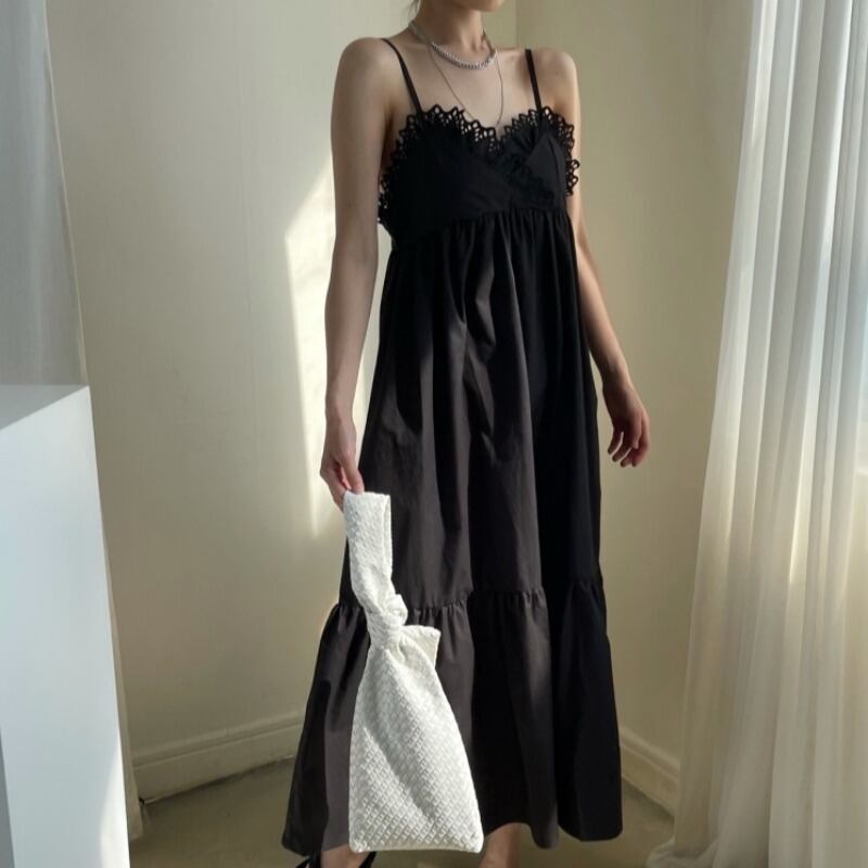 サマーレースVネックウェスト薄手ロングホルタードレス 夏物 韓国婦人24919996269