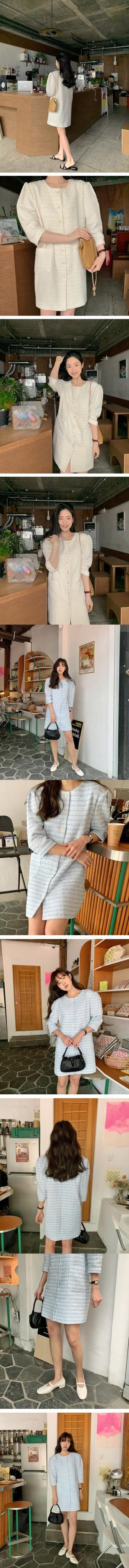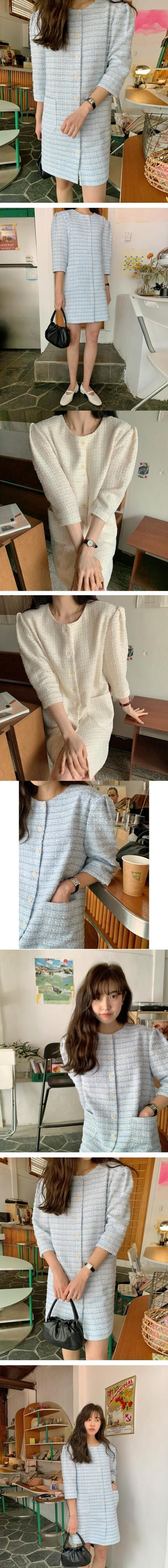ラウンドネックダブルスリーブツィードドレス レディース Oネック 韓国婦人51854684500