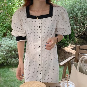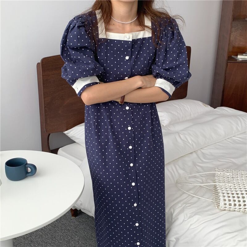 サマーカラールーズスリーブドレス ロングスカート 夏物 スクウェア ステッチ 韓国婦人9087711937