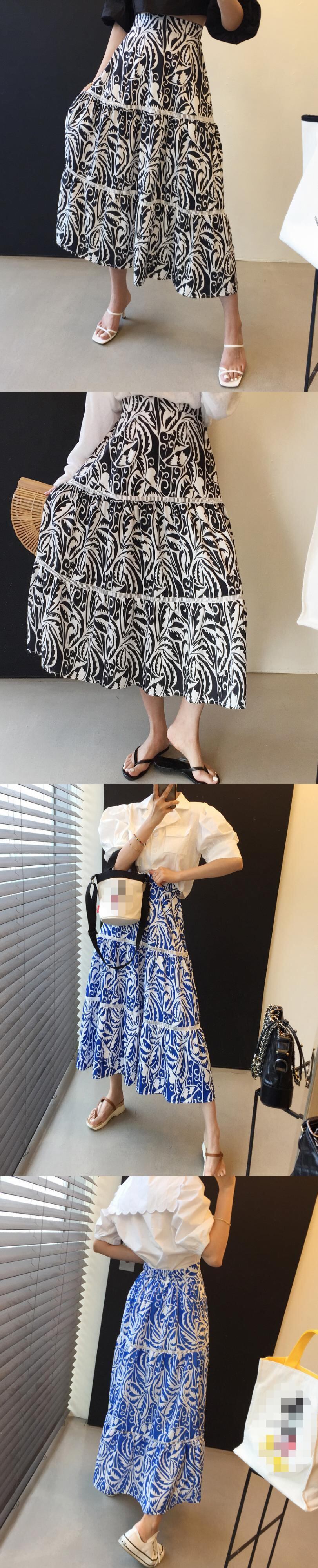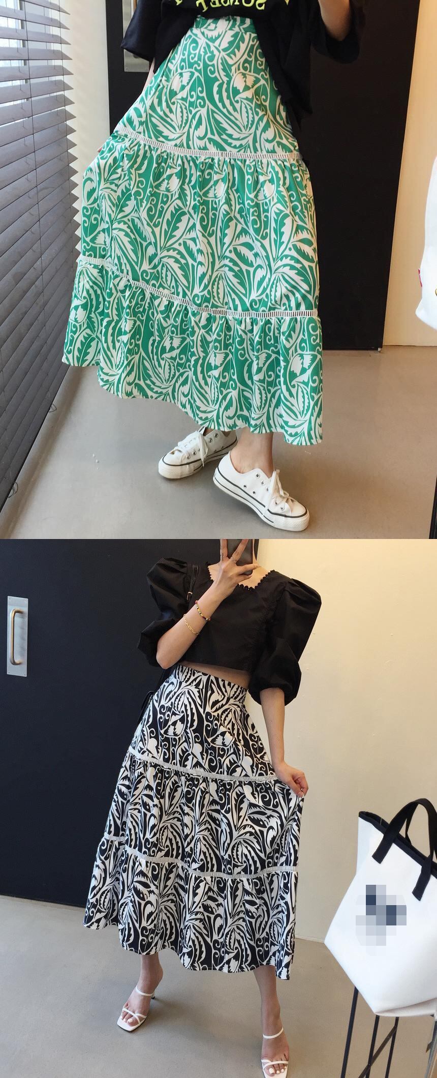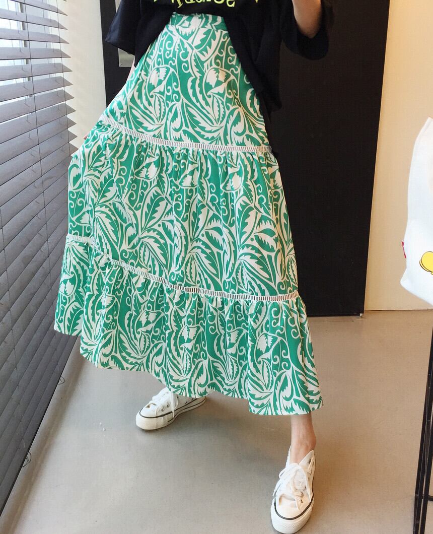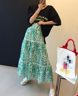 色:黒いTシャツ,緑の花のスカート,ブラックフローラルスカート,ブルーフラワースカート