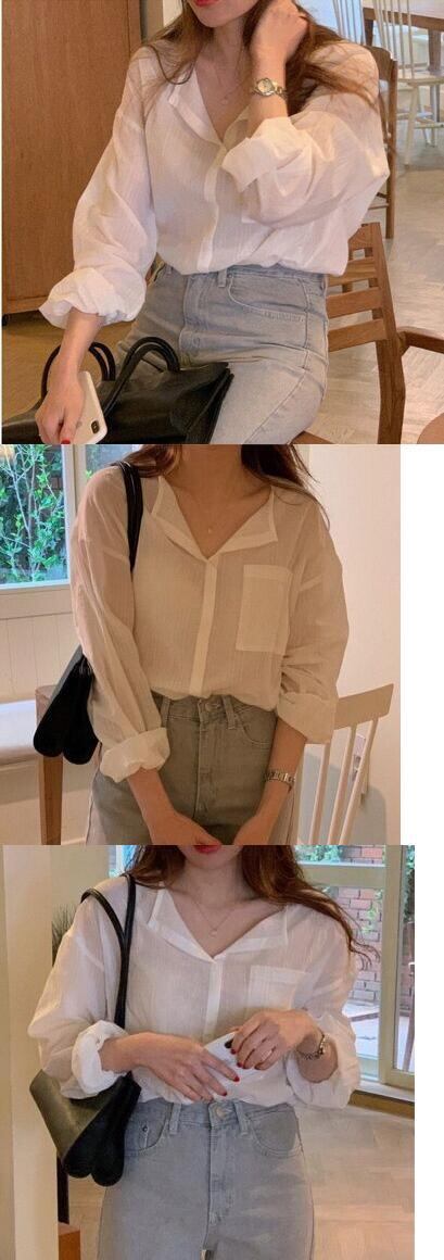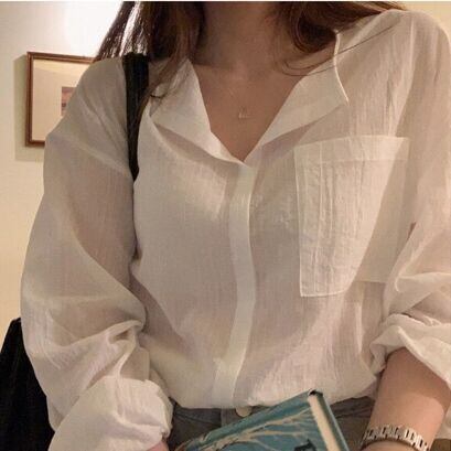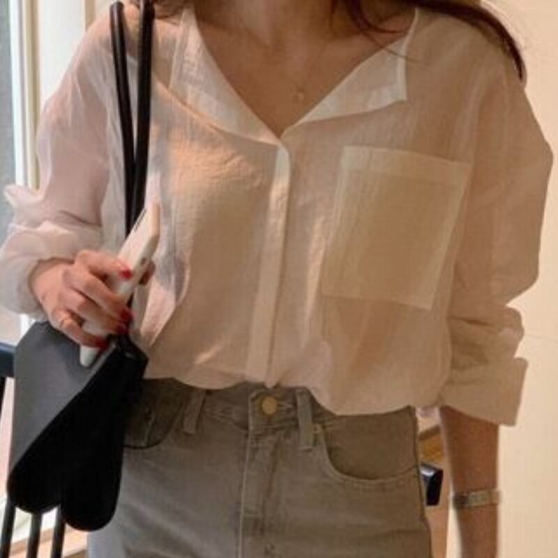 サマースタイルルーズポケットラウンドネック薄手シャツ トップス レディース ロング 夏物 Oネック 韓国婦人81689734651