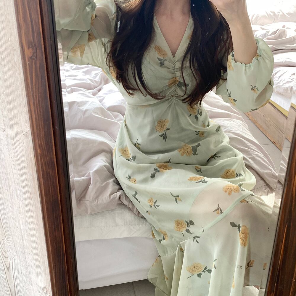 ドレス Vネックウェスト薄手Flowerデザイン フローラルスカート スプリング 春物 サマー 夏物 花柄 フラワーデザイン 韓国婦人46910509461
