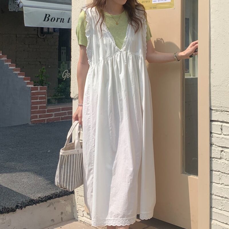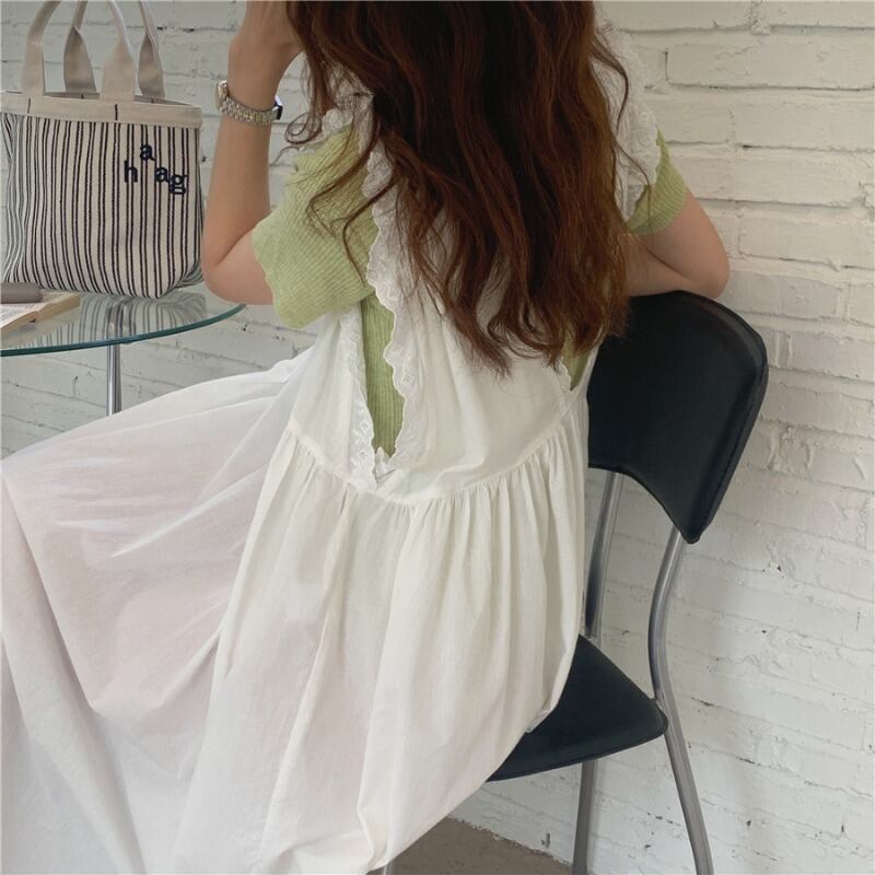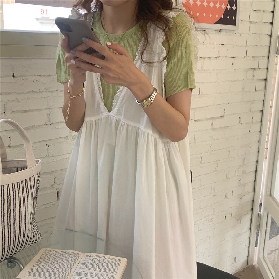 レディースサマーグリーンセーター ホワイトレースVネックスカート ドレス 夏物 韓国婦人60699870552
