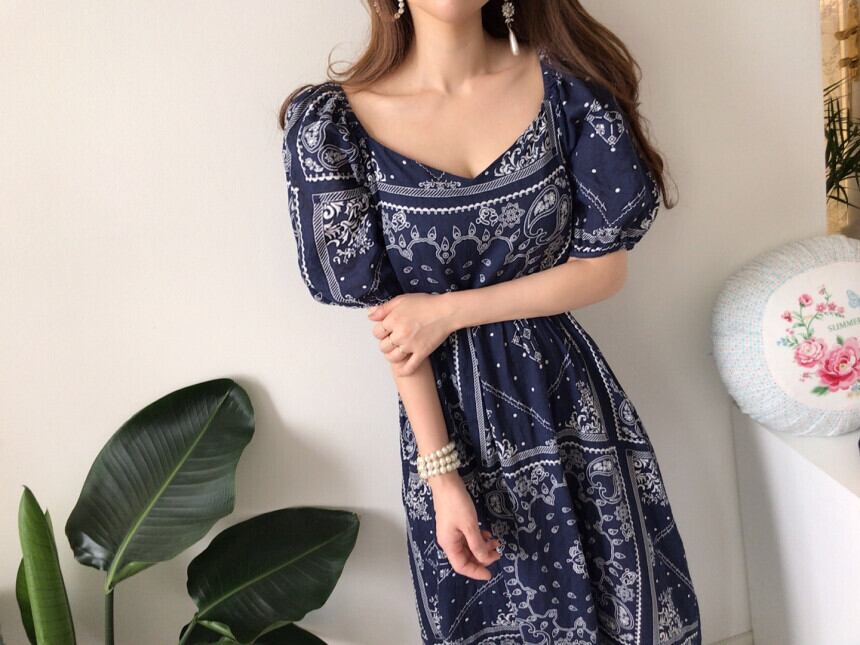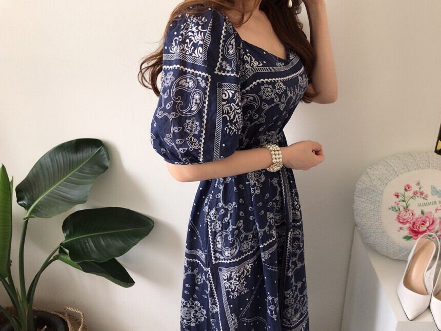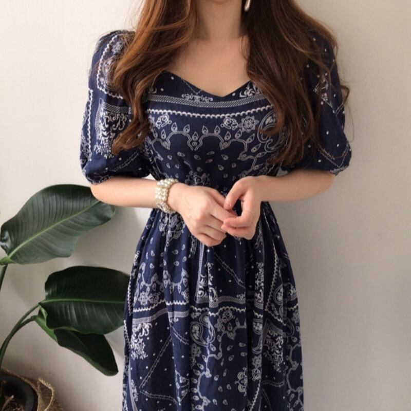 スタンダードエスニックプリント柄ハイウェストウェストスリムスリーブカラードレス ロングスカート サマー レトロ 夏物 スクウェア 韓国婦人37941181832