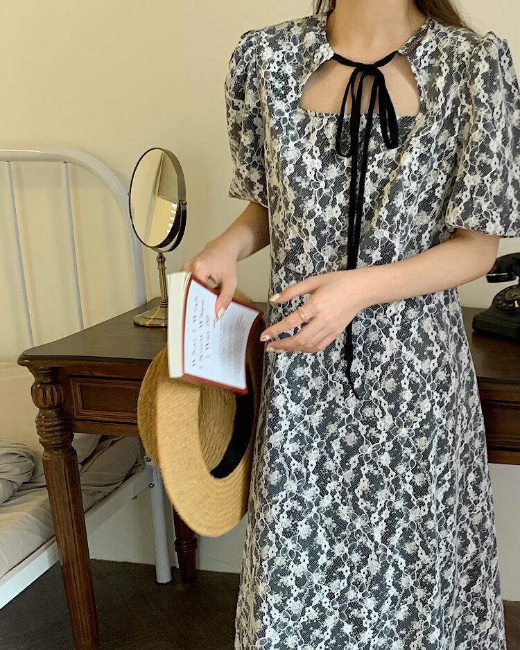 サマースタンダードレースダークブラックドレス レトロ 夏物 韓国婦人11606556799