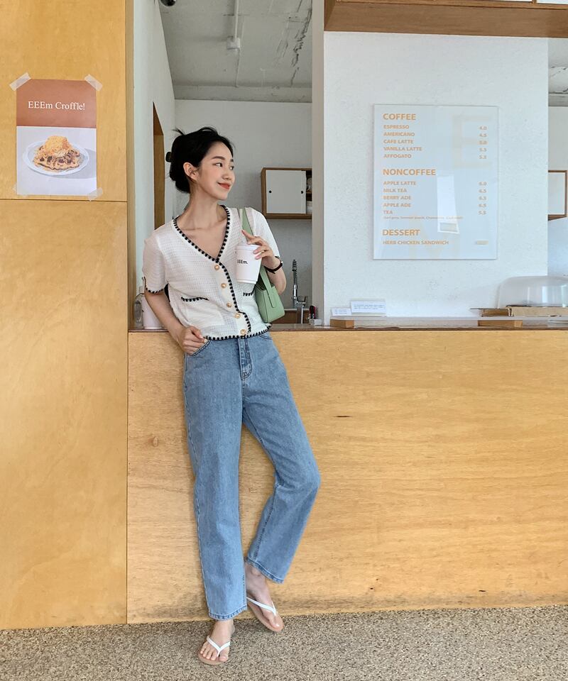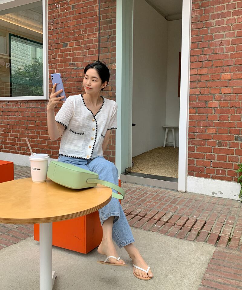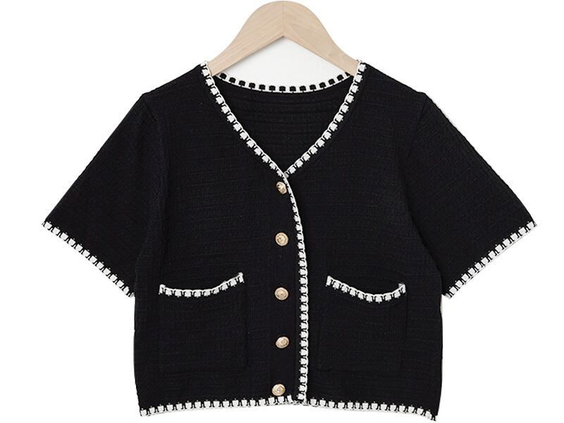 サマーカラーVネックカジュアルポケットニットトップス 夏物 韓国婦人75210384724