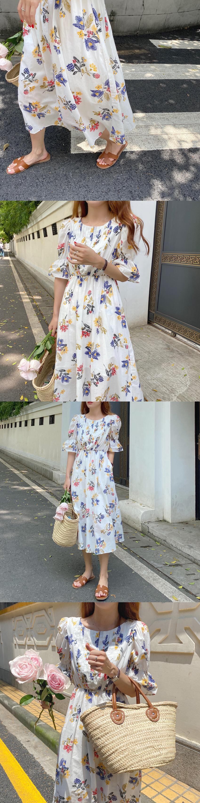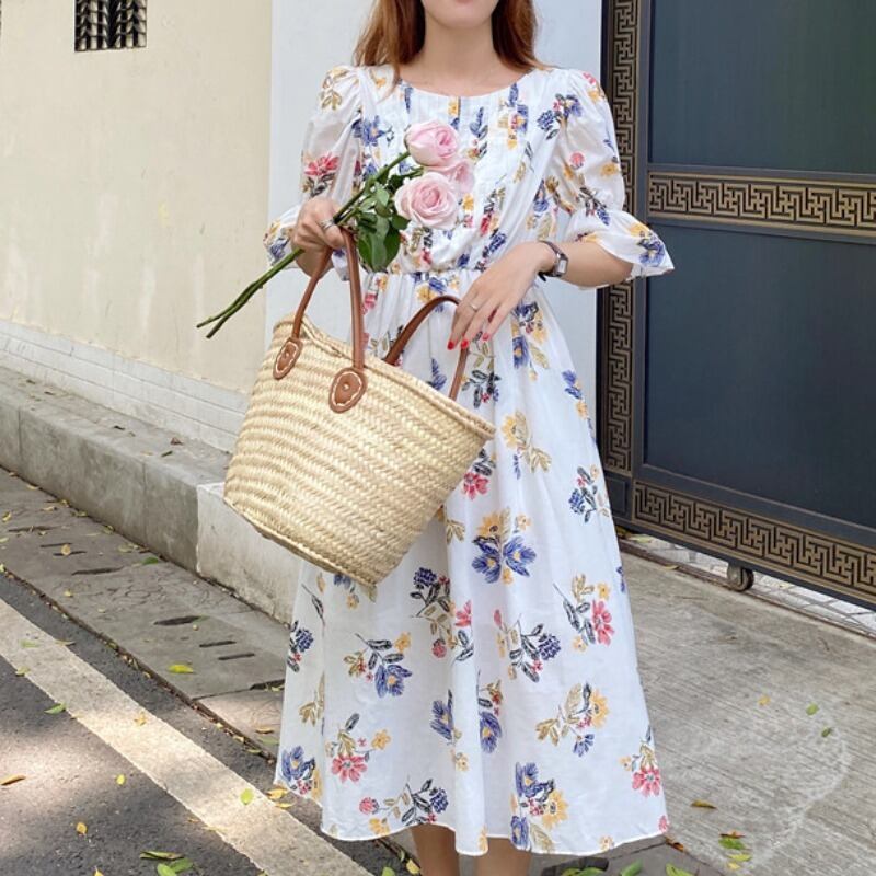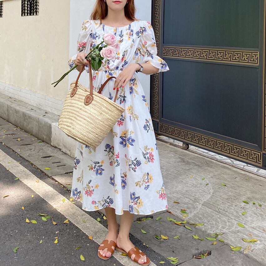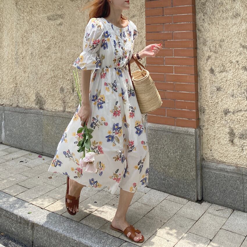 ドレス サマースタンダードラウンドネックウェストスリーブフローラルスカート ロング レトロ 夏物 花柄 Oネック 韓国婦人94924284030