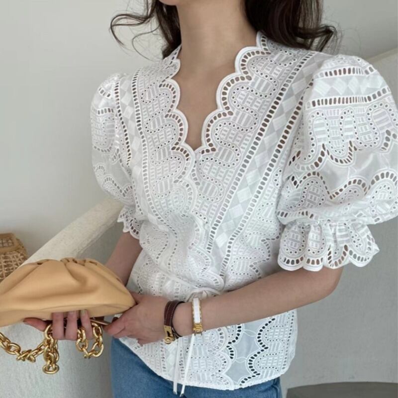 サマーレースウェストVネックシャツ トップス レディース 夏物 韓国婦人82741743898