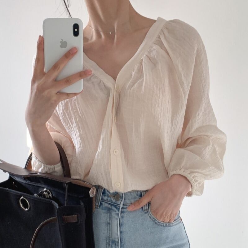 シャツ スプリングサマー薄手スリーブトップス ルーズカジュアルソリッド カラー ロング ランタンスリーブ 春物 夏物 ソリッドカラー 韓国婦人78200595296