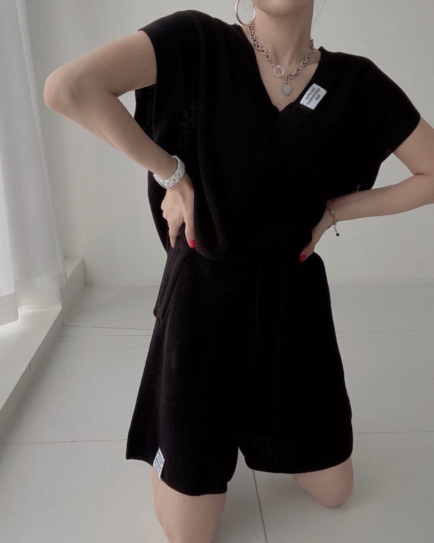サマーVネックカジュアルルーズシャツ ストレッチウェストショーツ ニットレディース エラスティック 伸縮 大人ガーリー スウィート キュート 夏物 ブルマー 韓国婦人89061152213