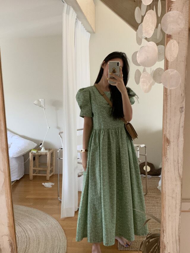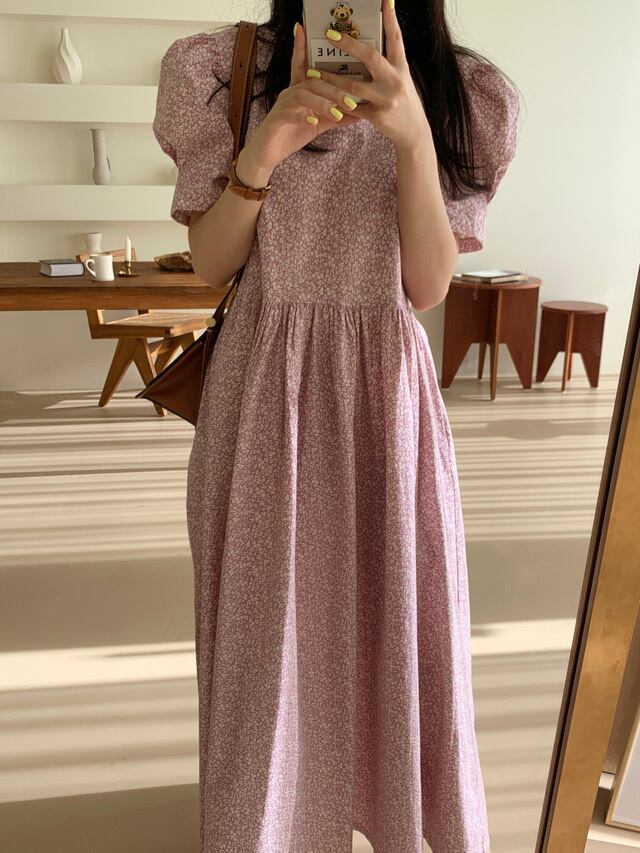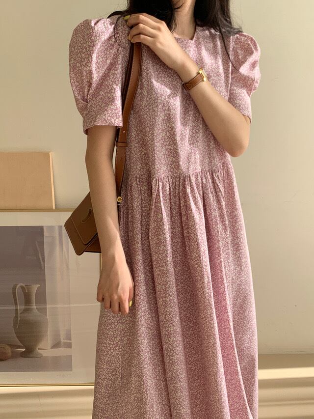 フローラルスカート サマースリーブハイウェストウェストルーズドレス ラウンドネックロング 夏物 花柄 Oネック 韓国婦人52101748223