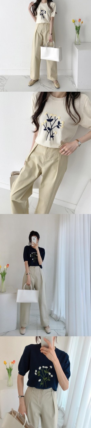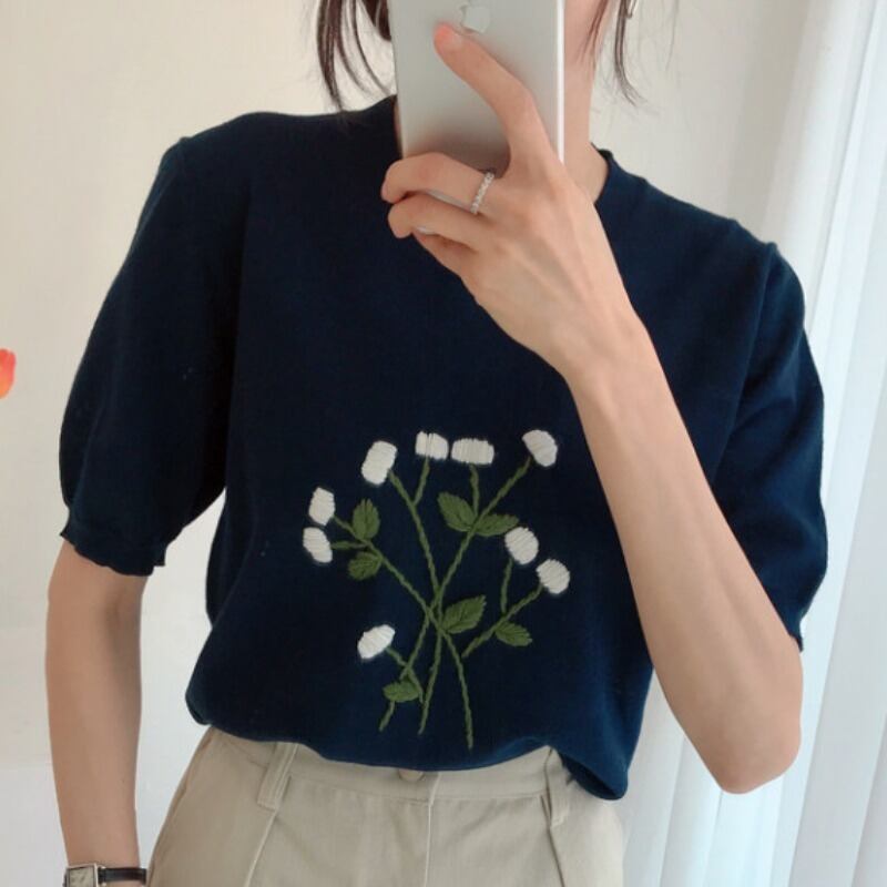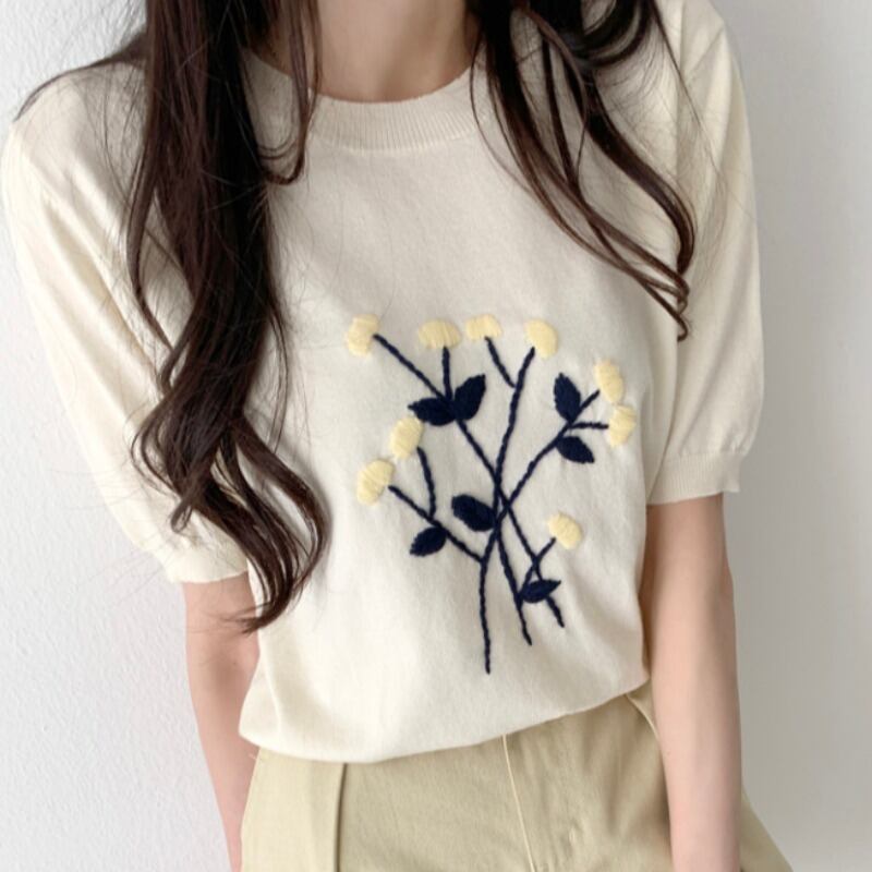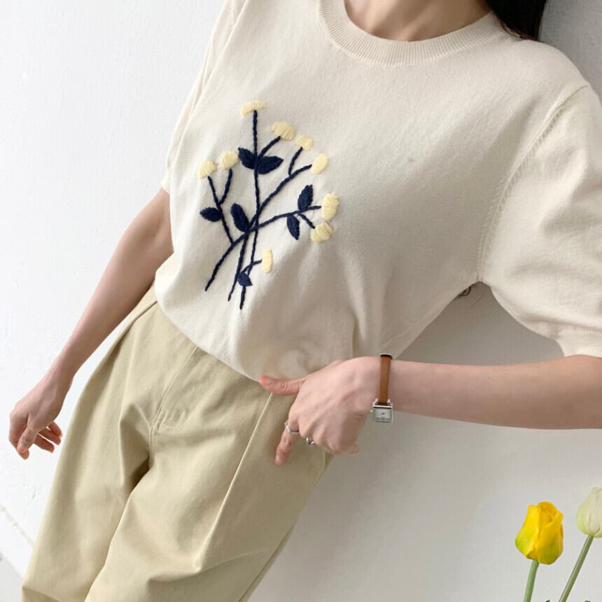 スタイル刺繍セーター レディースサマーラウンドネックルーズ薄手Tシャツ トップス 夏物 Oネック フラワーデザイン 韓国婦人72338701156