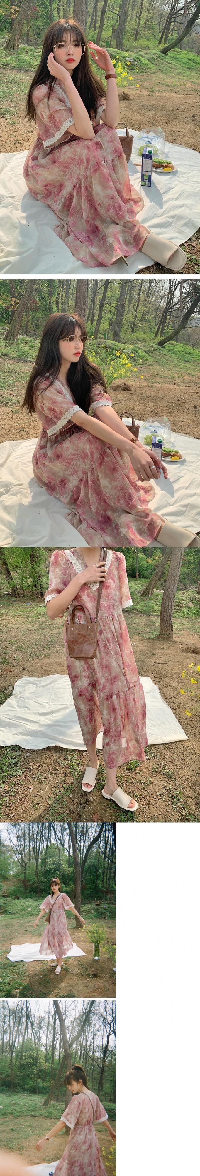 スタンダードレースVネックプリント柄ドレス サマースタイルギャザーシフォンスカート レトロ 夏物 韓国婦人46676770553
