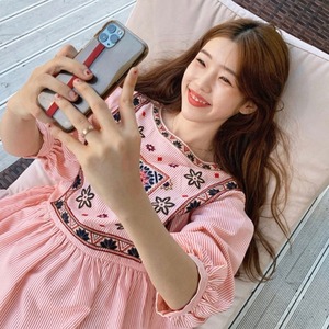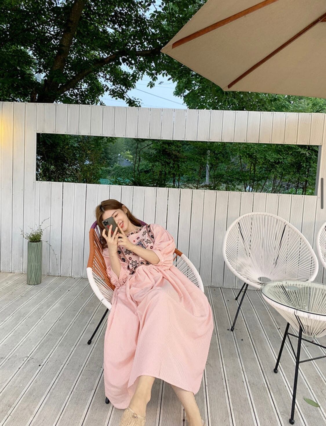 スカート スタンダードエスニック刺繍スリーブルーズストライプロングドレス レディース レトロ 韓国婦人68139279105