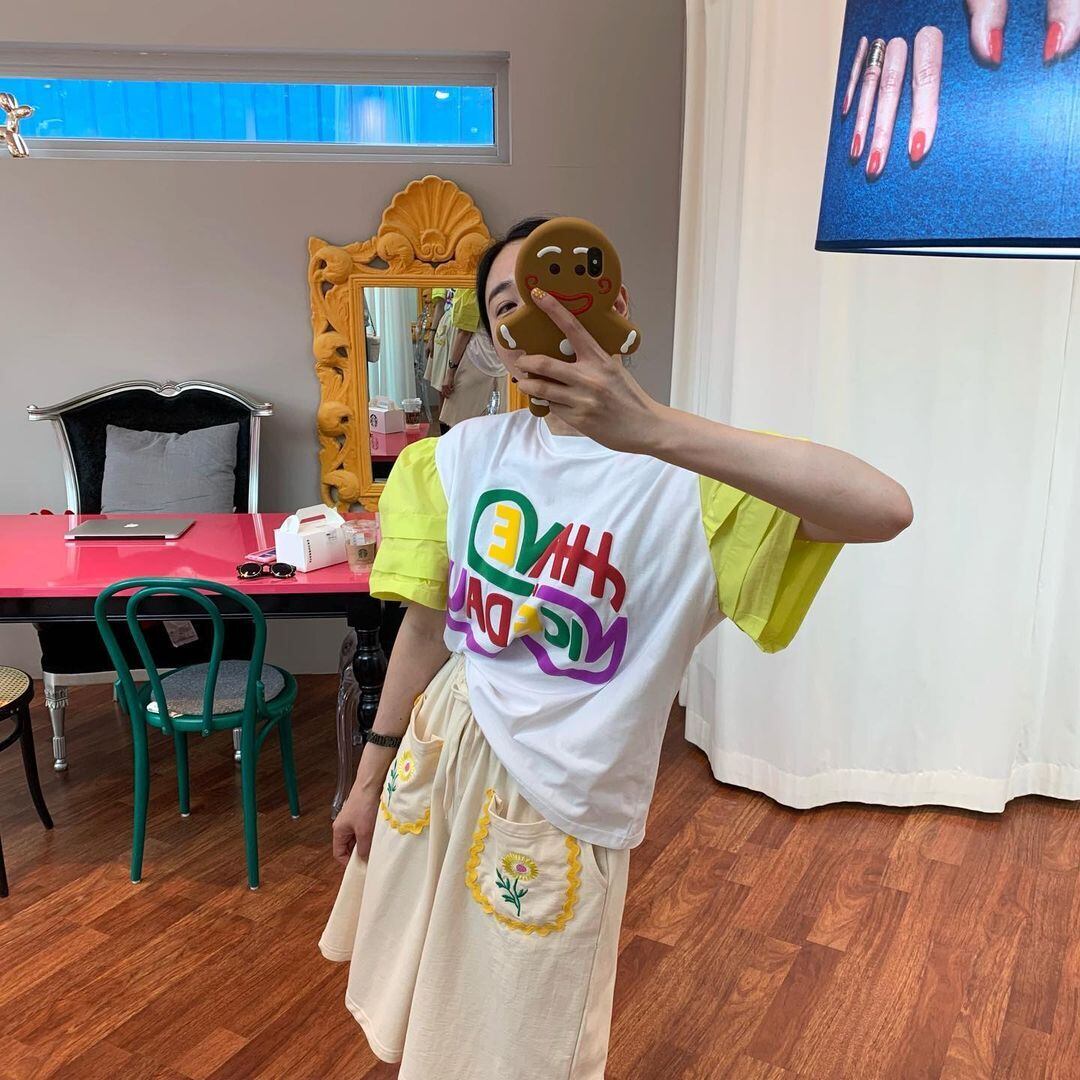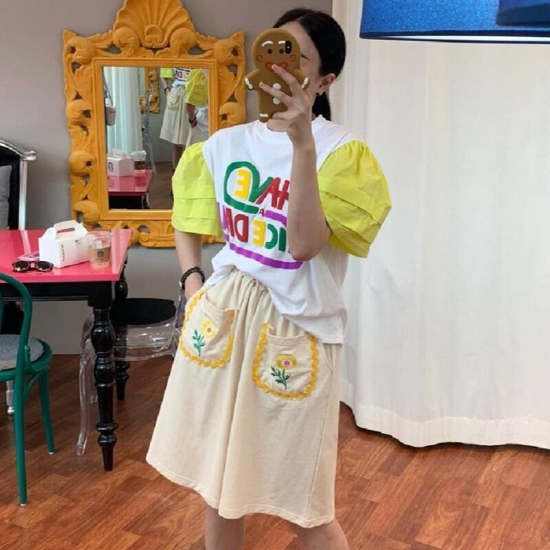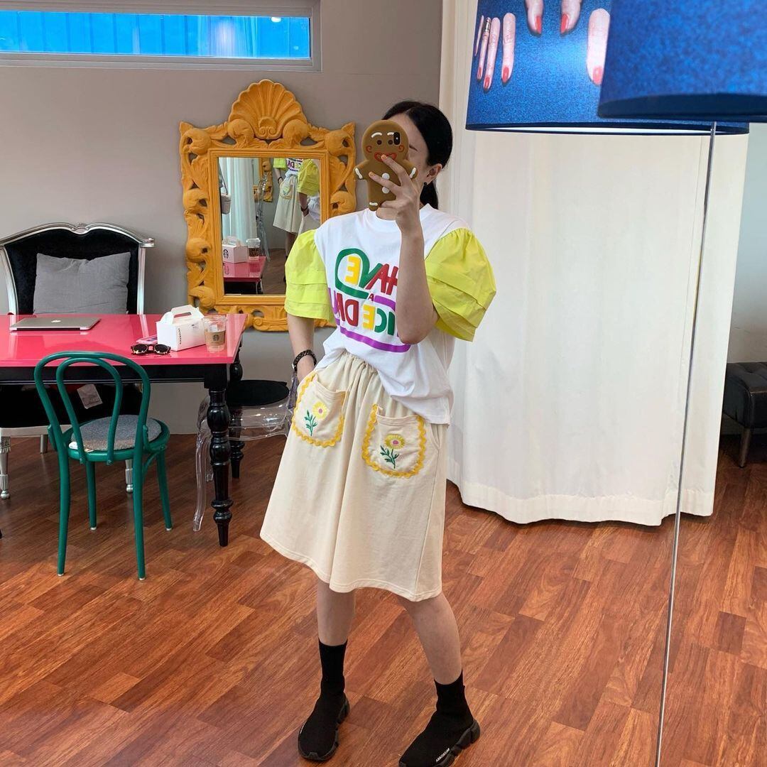 サマーカラースリーブTシャツ ショーツ レオパードスカート レッド 刺繍 夏物 ブルマー 韓国婦人10179659048