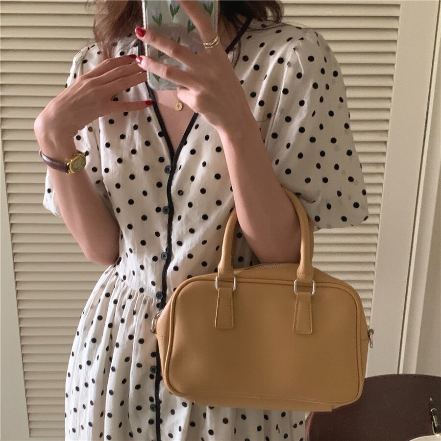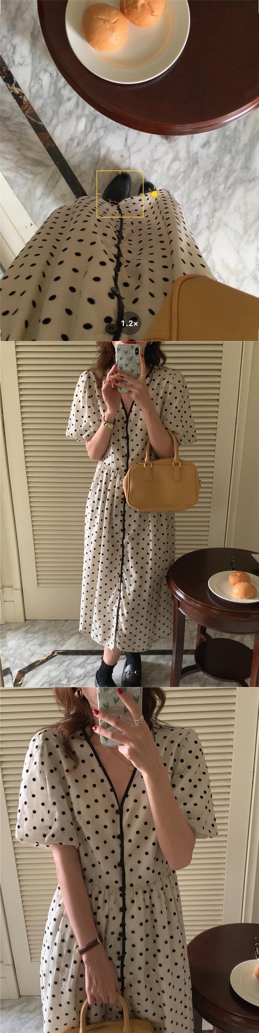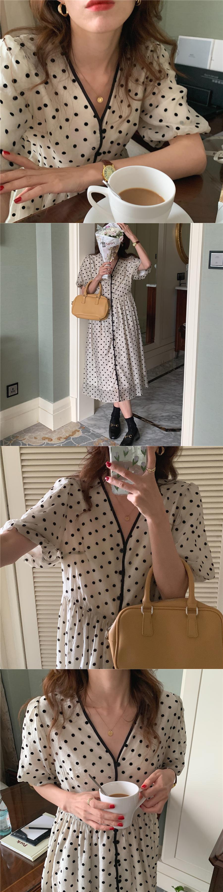サマースタンダードVネック水玉スリーブロングドレス レトロ 夏物 韓国婦人68158415697