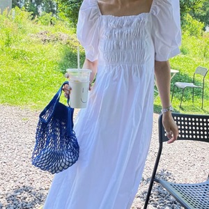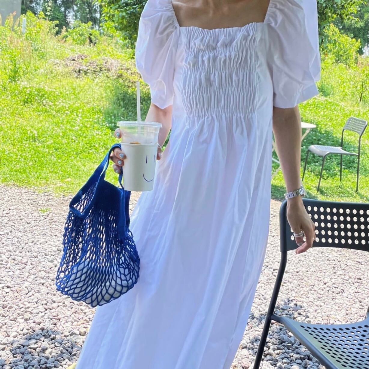 サマーカラーストレッチスリーブドレス ロングスカート エラスティック 伸縮 夏物 スクウェア 韓国婦人93414908718