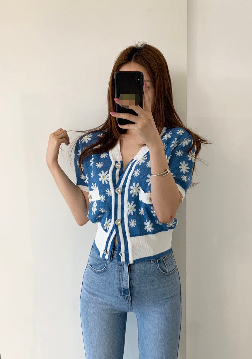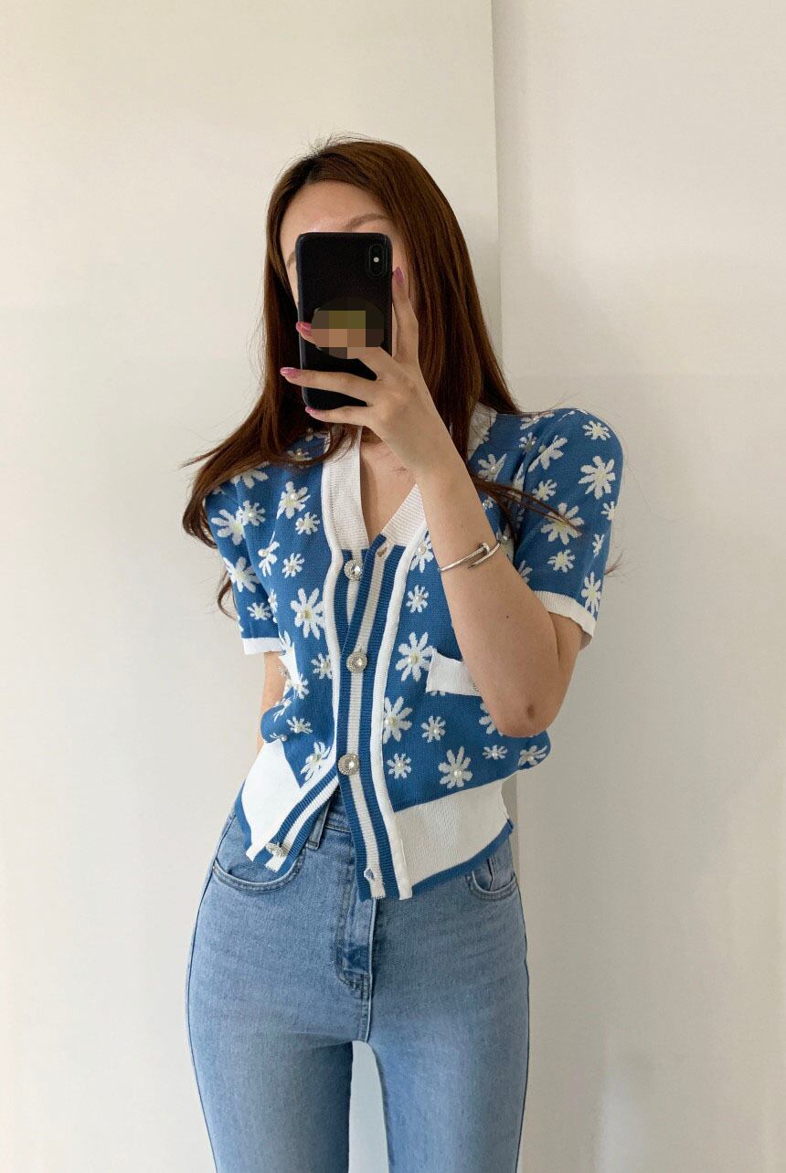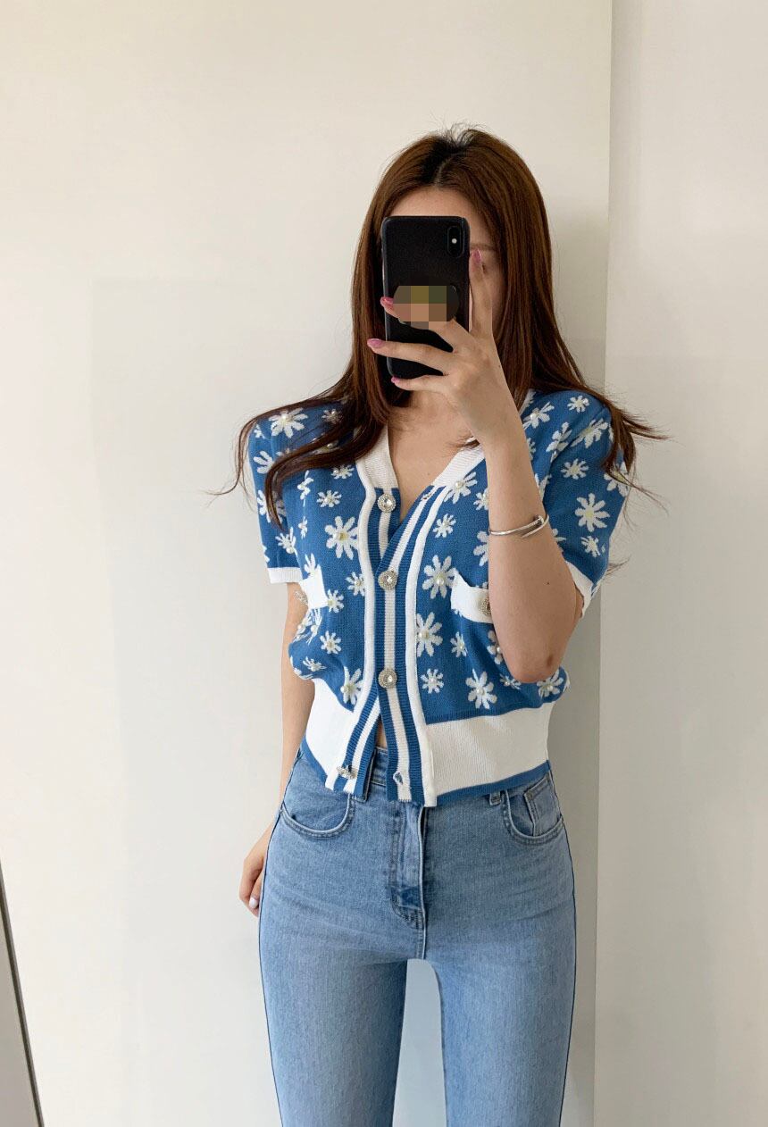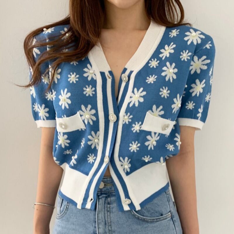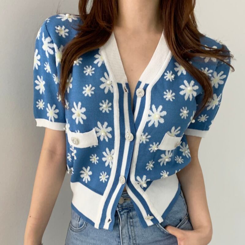サマーカラーVネックパールバックル薄手ニットカーディガンジャケット レディース 夏物 真珠 韓国婦人18759978847