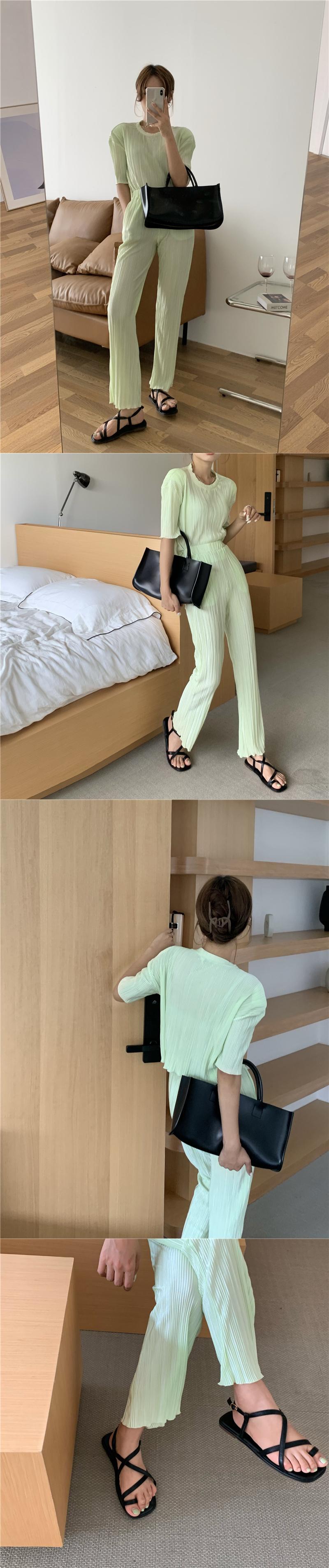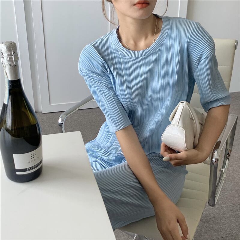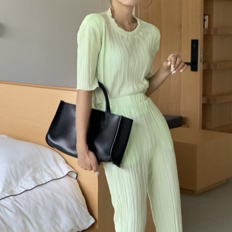 スタイルサマーミニマリストラウンドネックTシャツ ハイウェストプリーツパンツ レディース 夏物 Oネック 韓国婦人23370081159