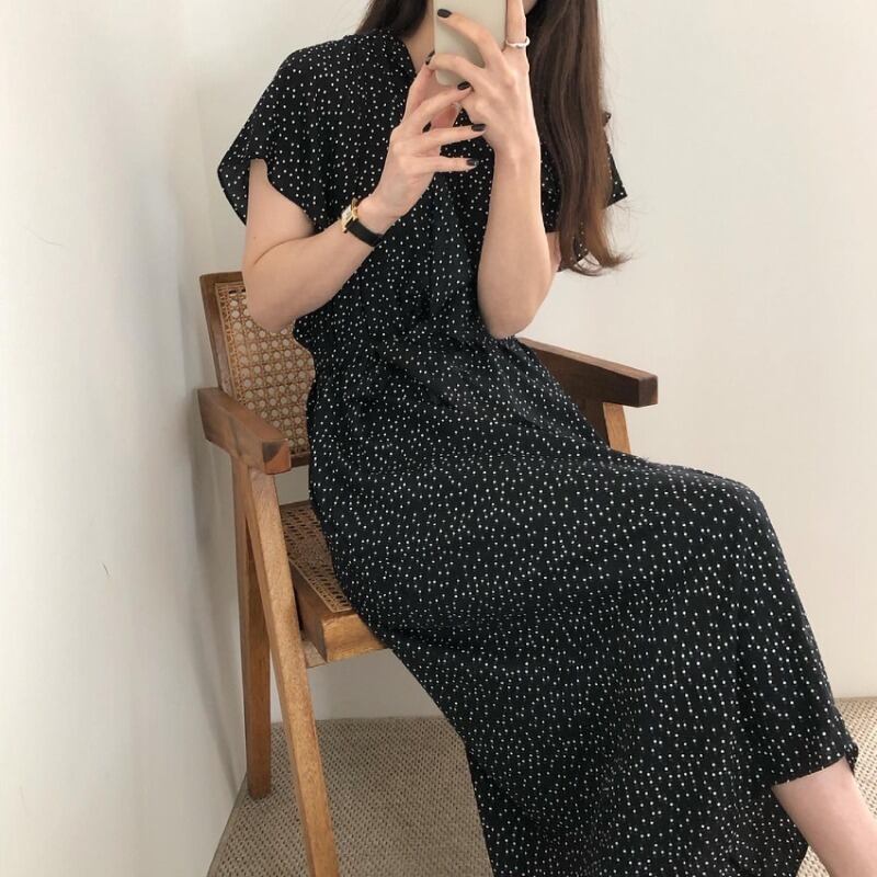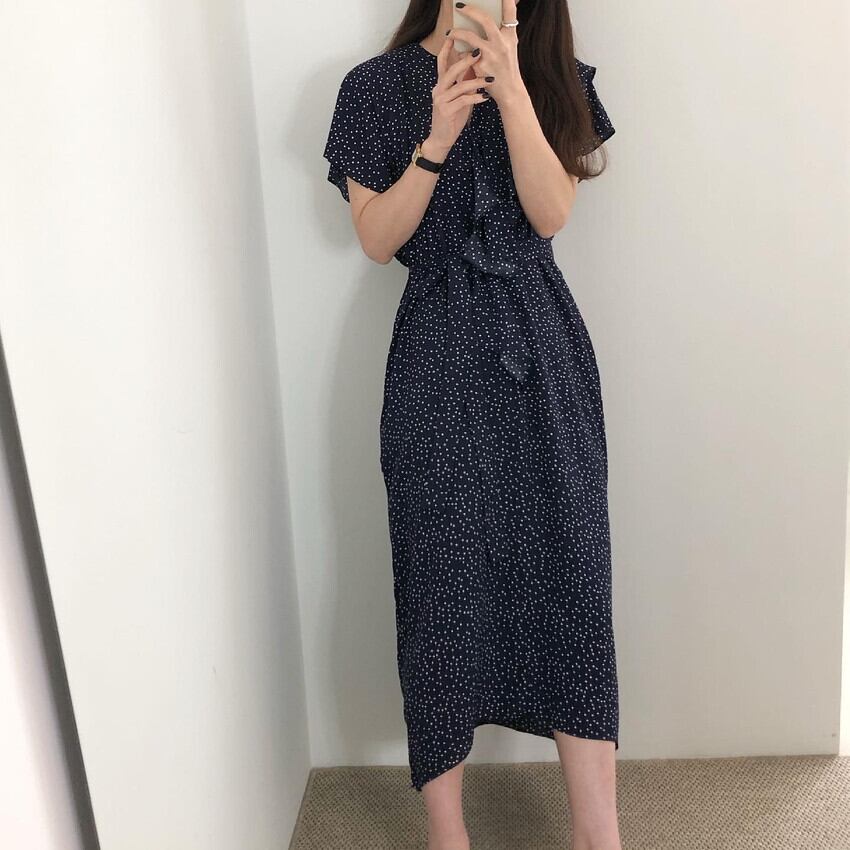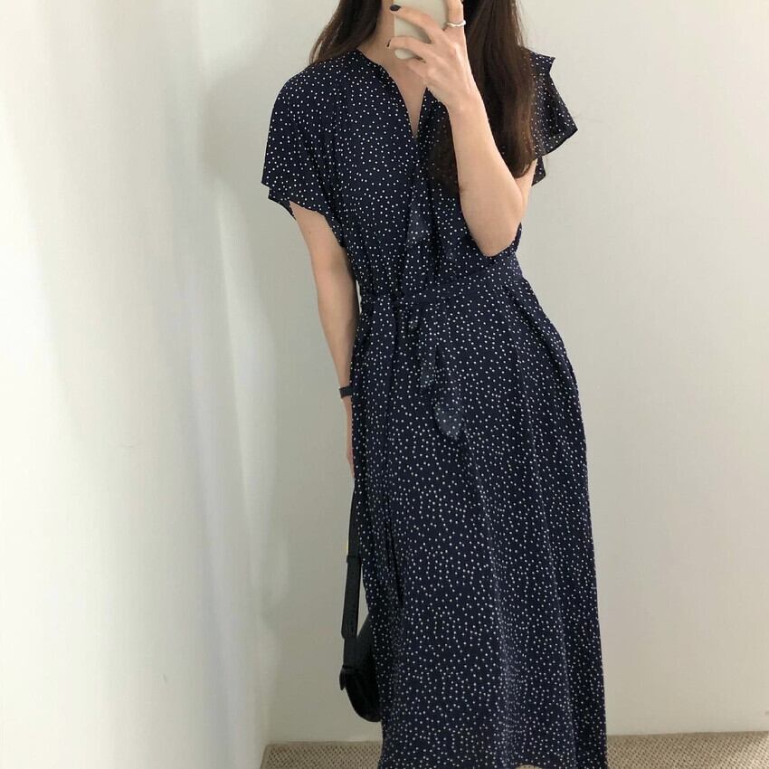 サマーVネックウェスト水玉シフォンドレス レディース 夏物 韓国婦人58005516177