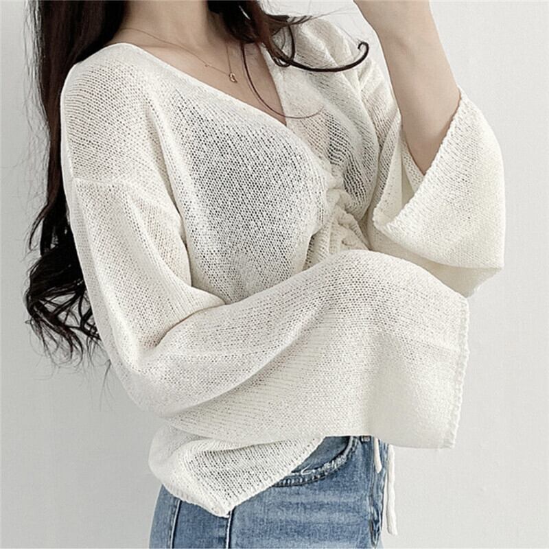 オータムスタンダードVネックスタイルルーズ薄手ギャザーセーター シャツ レディース ロング レトロ 秋物 韓国婦人632867626