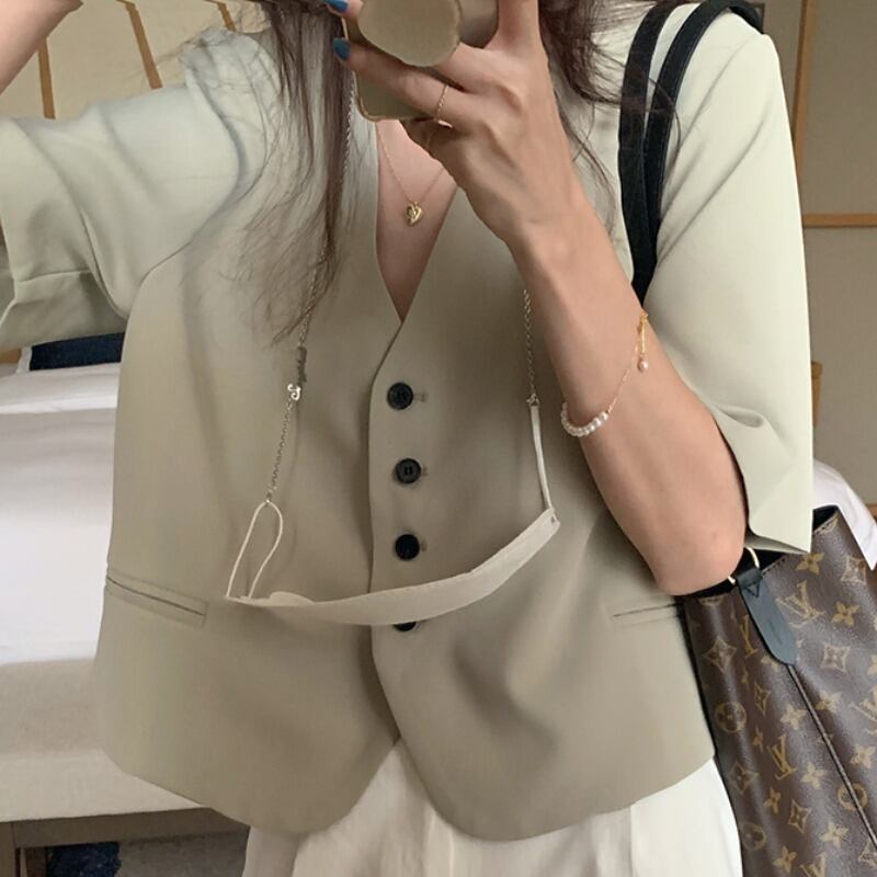 Vネッククロップドジャケット レディースサマースタンダードスタイルブレザー レトロ 夏物 韓国婦人3700976396