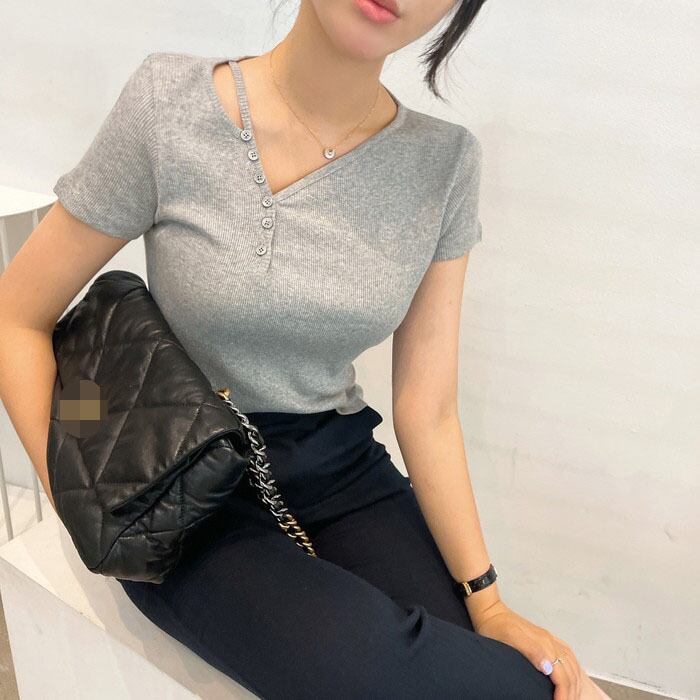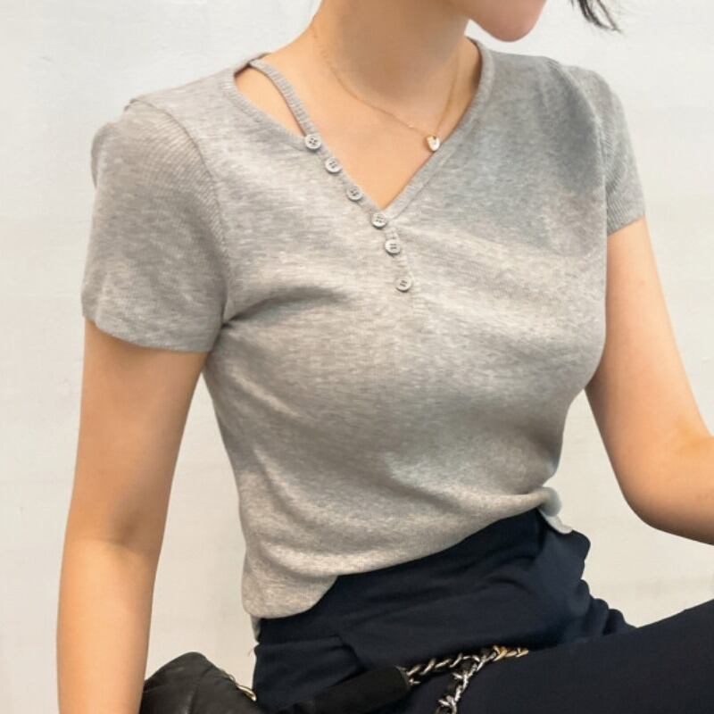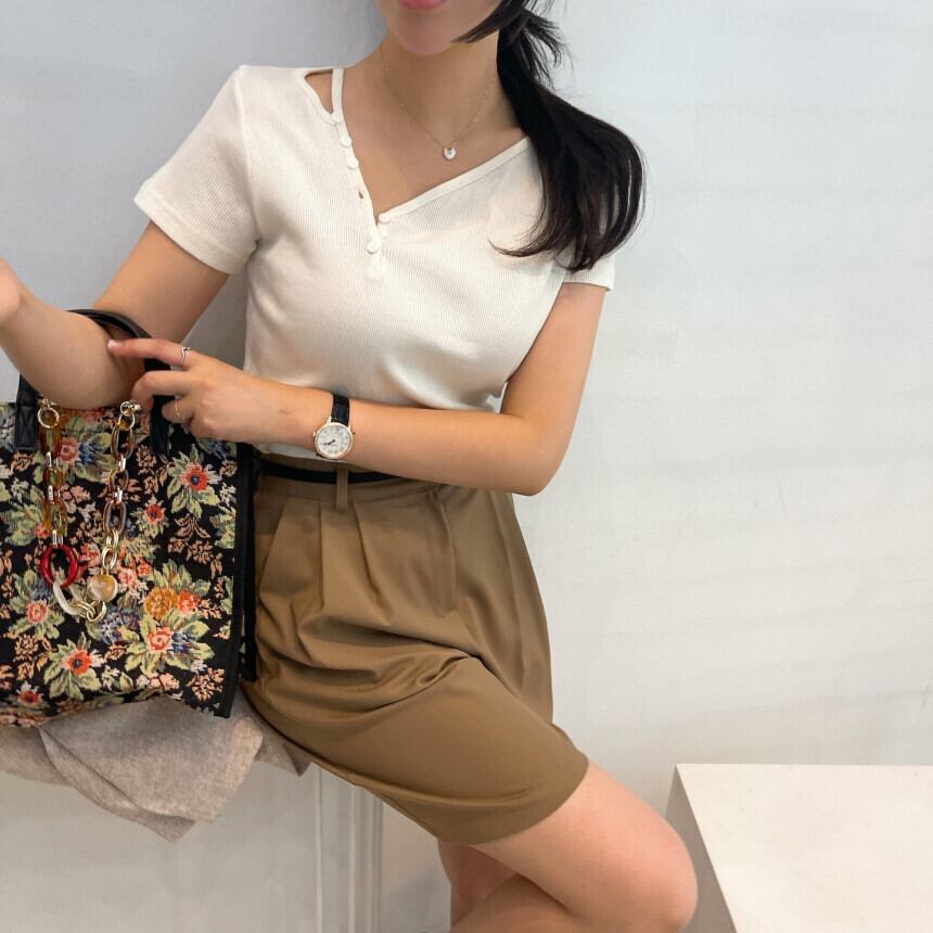 サマーVネックバックルストレッチTシャツ トップス レディース エラスティック 伸縮 夏物 韓国婦人2723645188