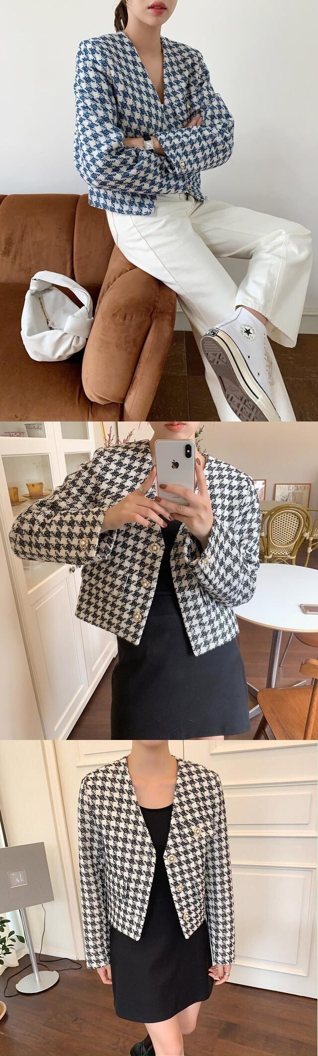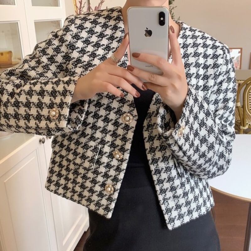 オータムスタンダードスタイルVネックツィードパールバックルルーズショートコート レディース レトロ 秋物 真珠 韓国婦人56114984175