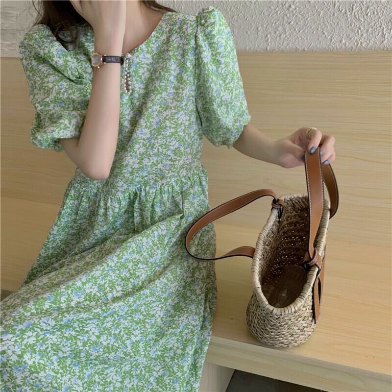 スタイルパールボタンスリーブドレス フローラルシフォンスカート サマー 夏物 花柄 真珠 韓国婦人3212011779
