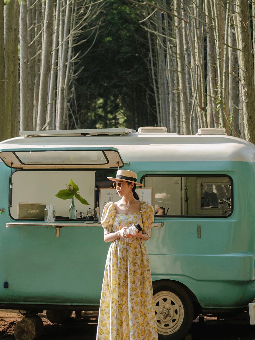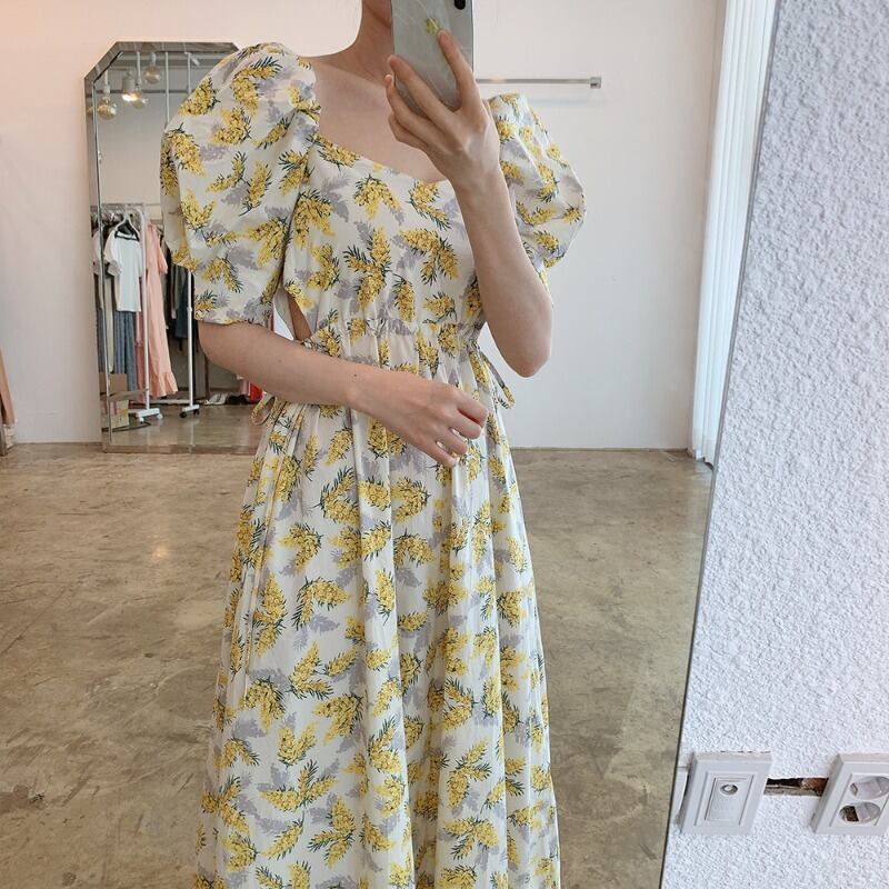 サマースリーブフローラルギャザードレス シフォンスカート ウェストロング 夏物 花柄 スクウェア 韓国婦人75899254643