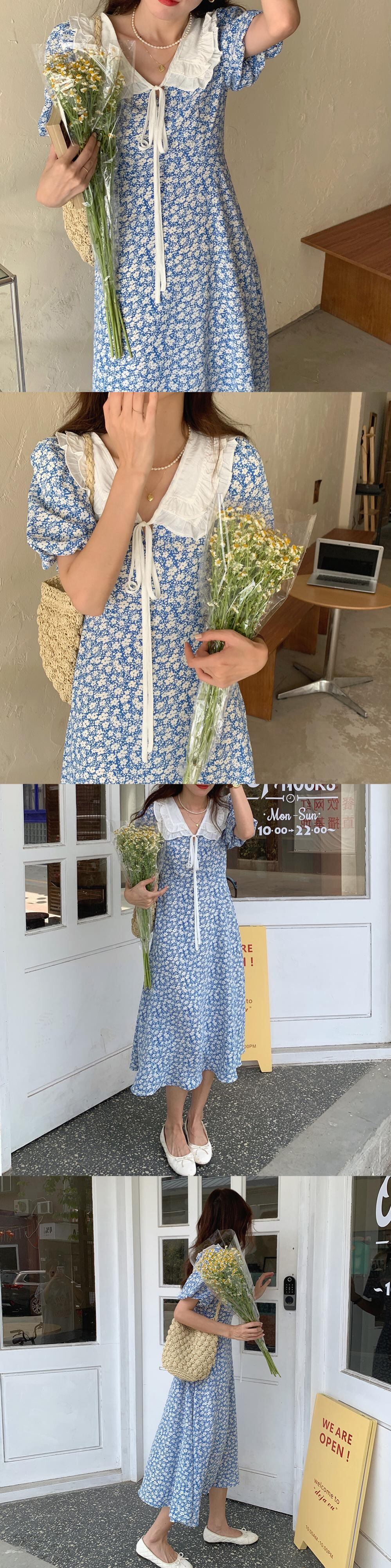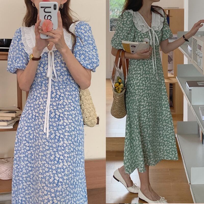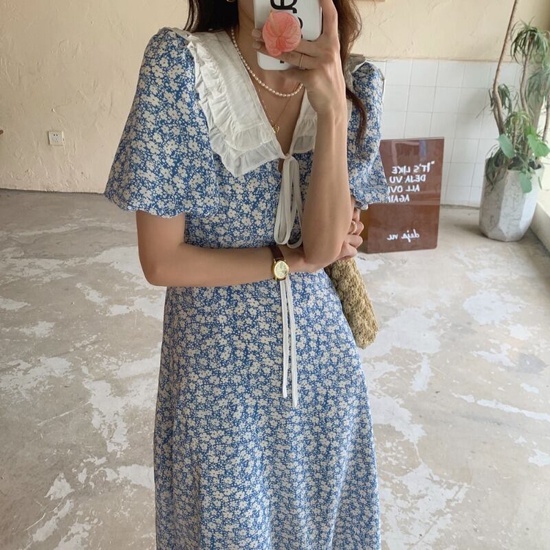 カラースリーブハイウェストウェストフローラルドレス サマースタンダード レトロ 大人ガーリー スウィート キュート カジュアル 夏物 花柄 韓国婦人94890711770