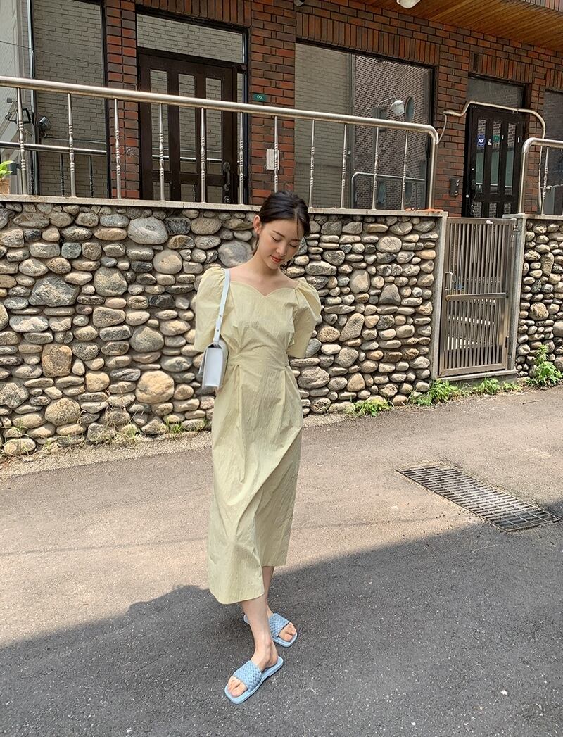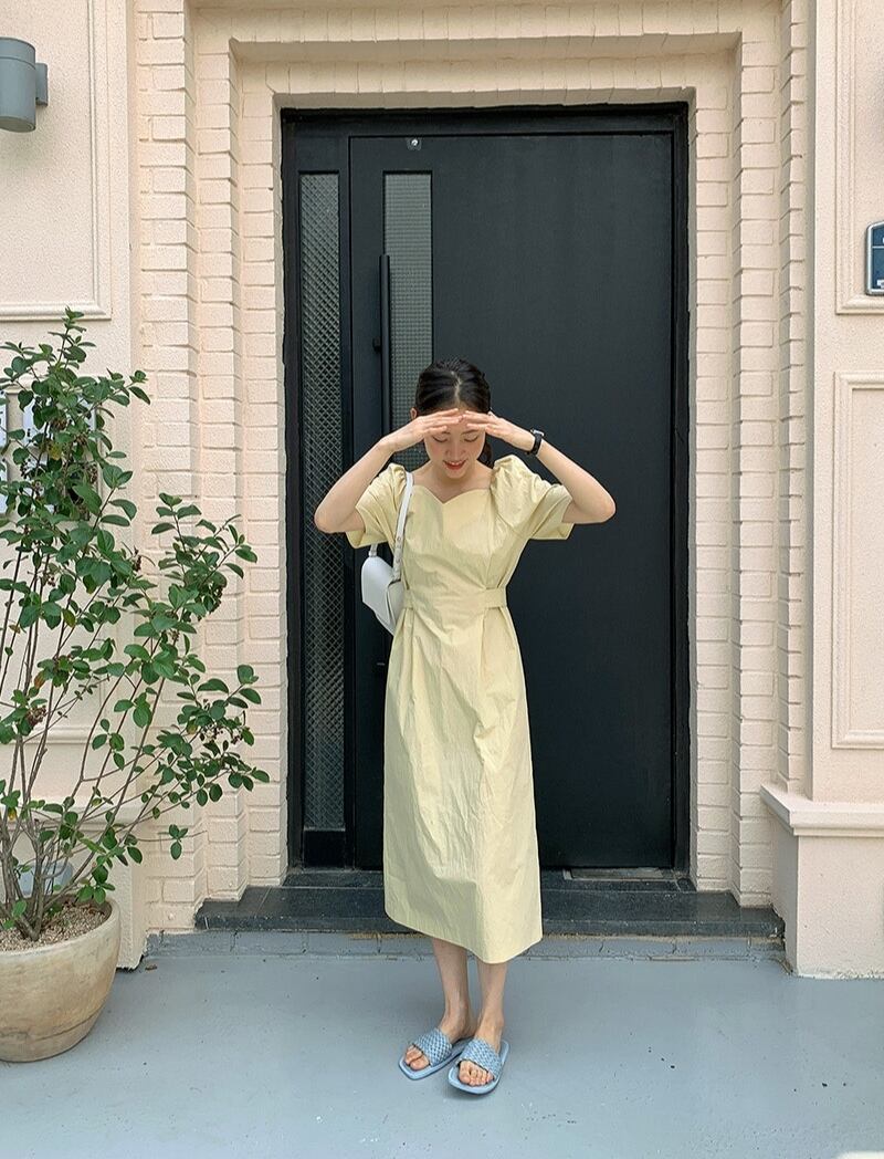 サマーVネックホワイトスリーブウェストロングドレス レディース 夏物 韓国婦人50355671488