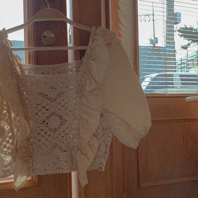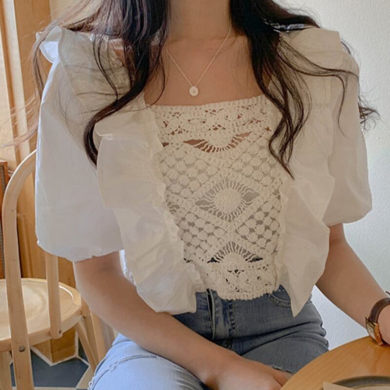 サマーカラーレーススリーブシャツ トップス レディース 夏物 スクウェア ステッチ 韓国婦人54213524392