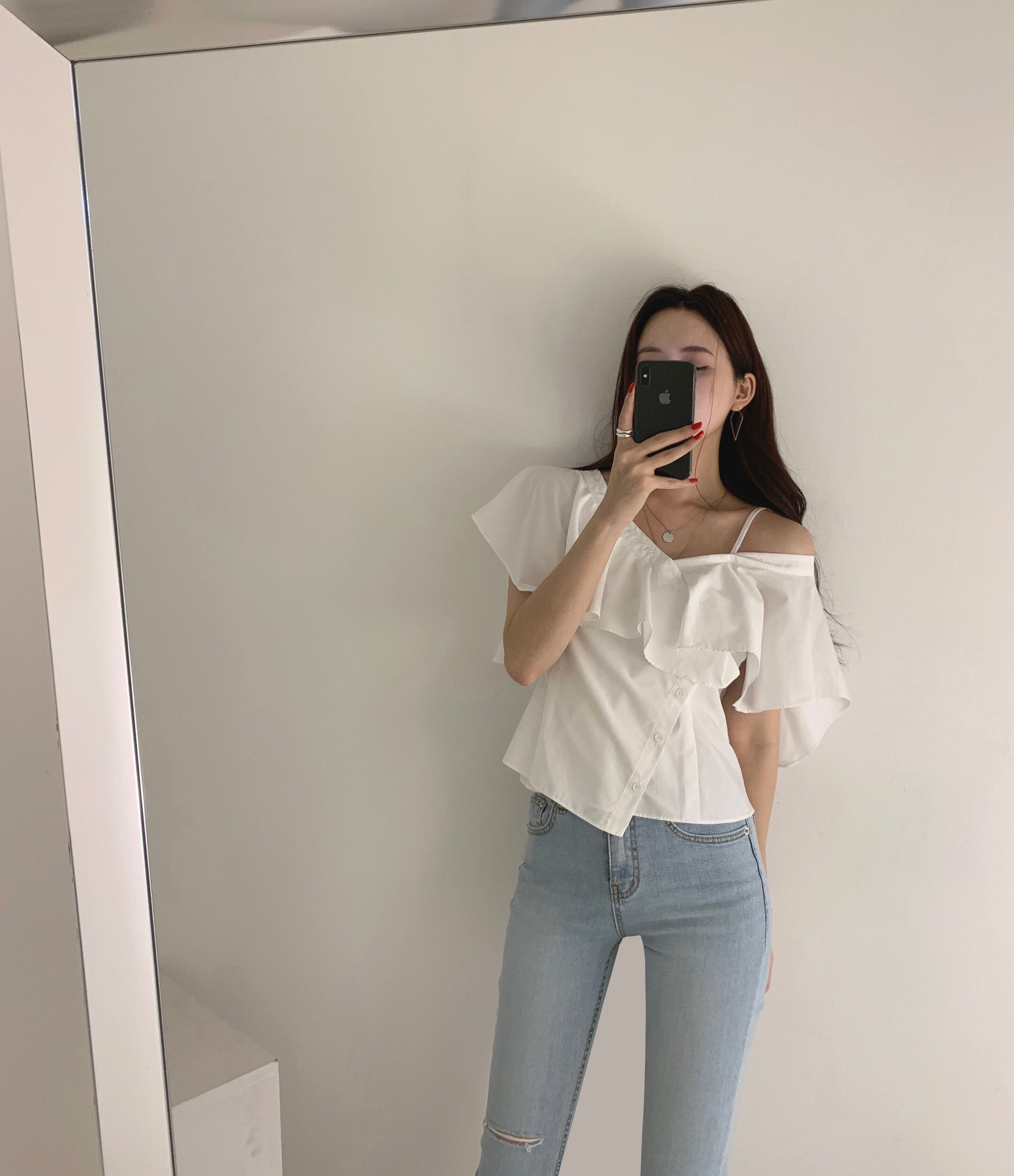 シャツ バックルストラップレスラッフルVネックトップス サマー 夏物 韓国婦人36509671756