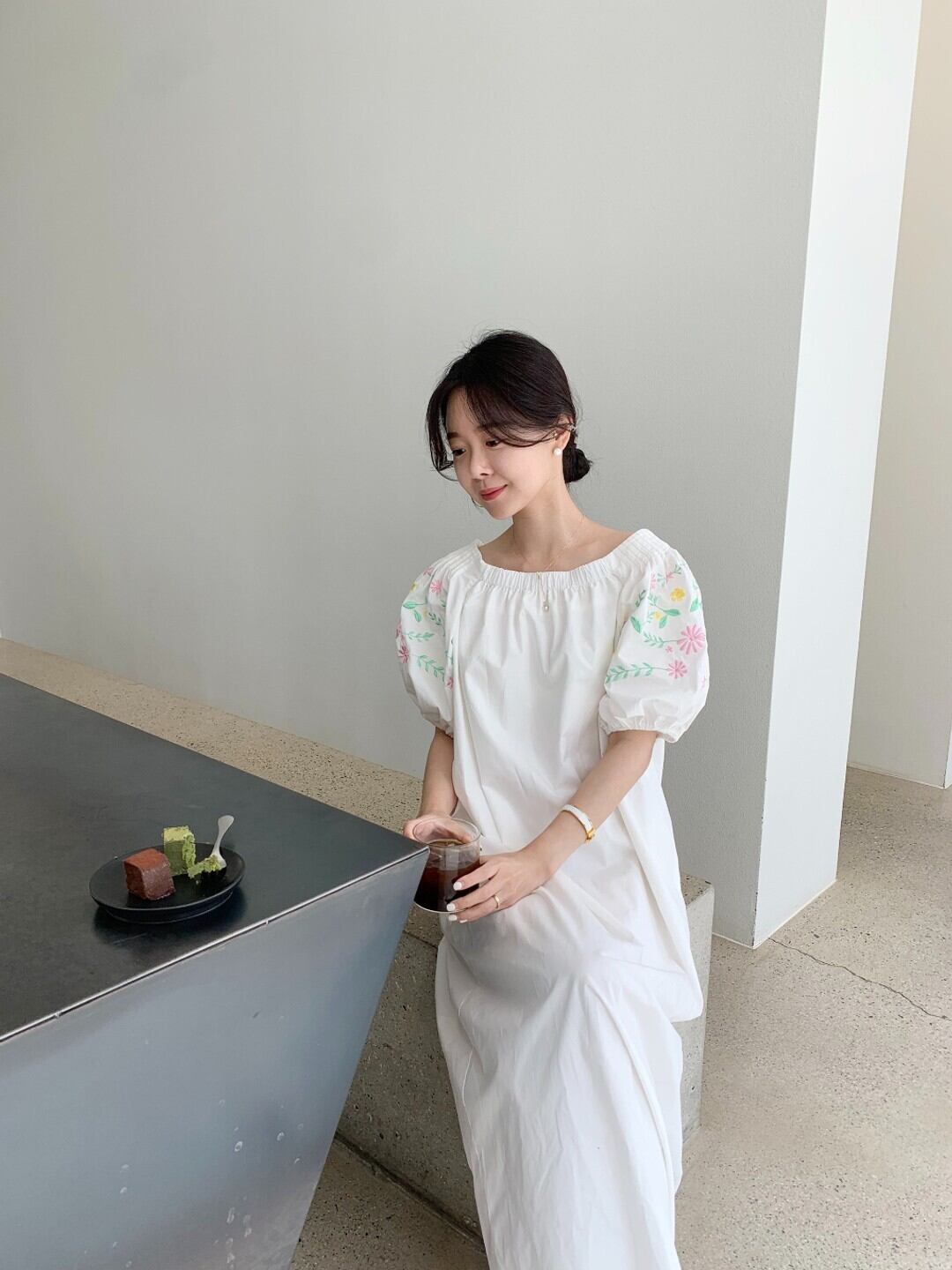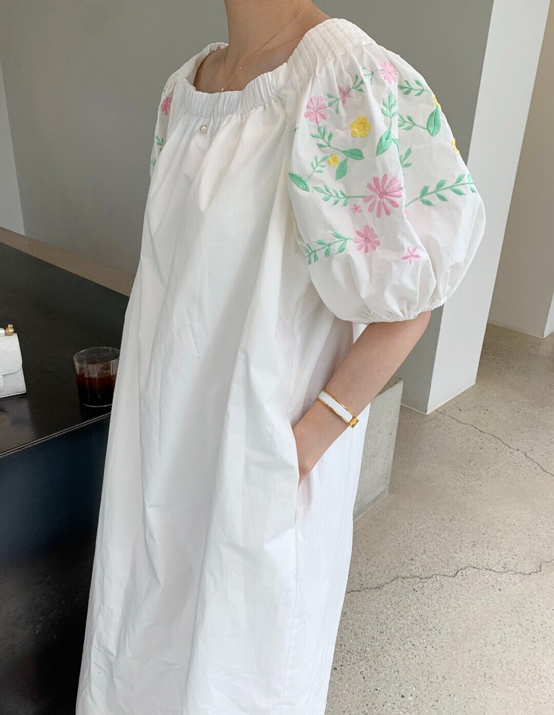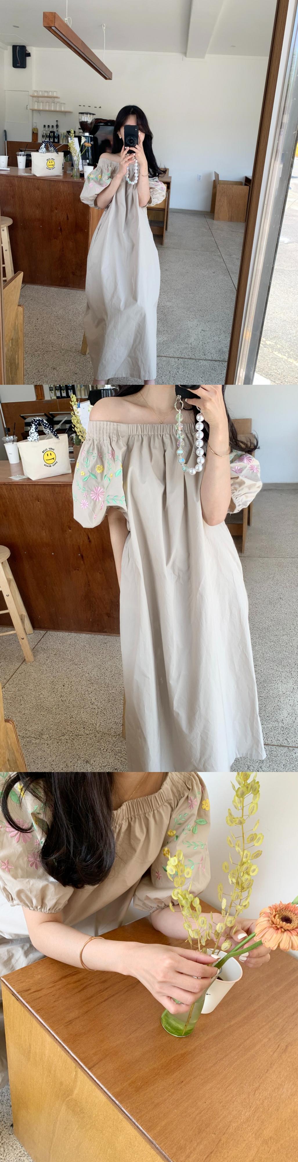 サマーストレッチワンショルダースリーブ刺繍フローラルロングドレス レディース ランタンスリーブ エラスティック 伸縮 夏物 花柄 韓国婦人82612319217