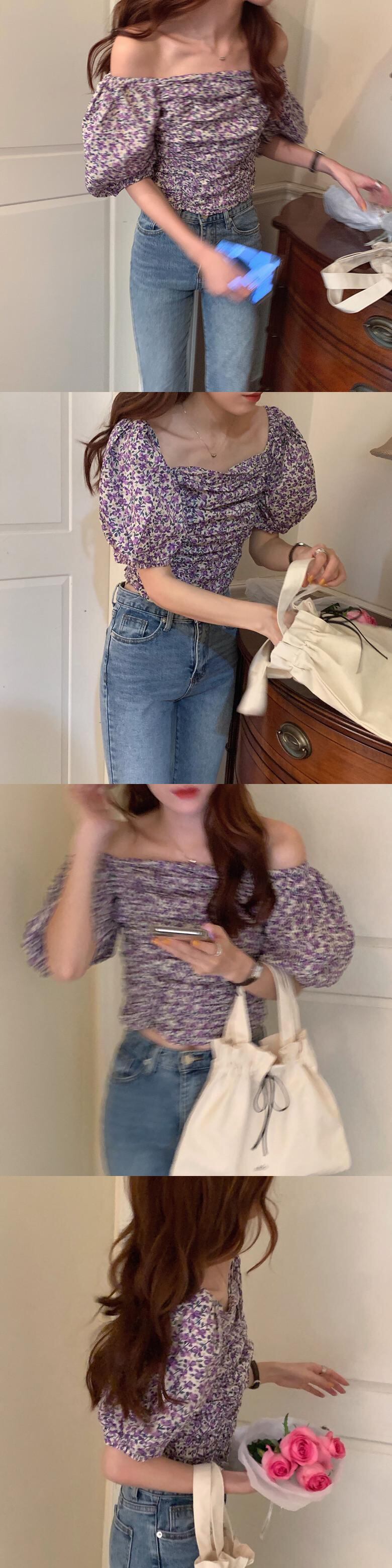 シフォンサマープリーツフローラルショートトップス 夏物 花柄 スクウェア 韓国婦人3785659039