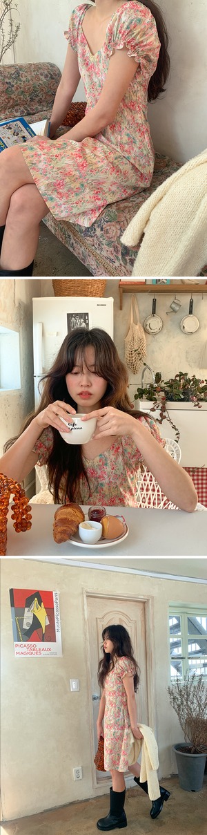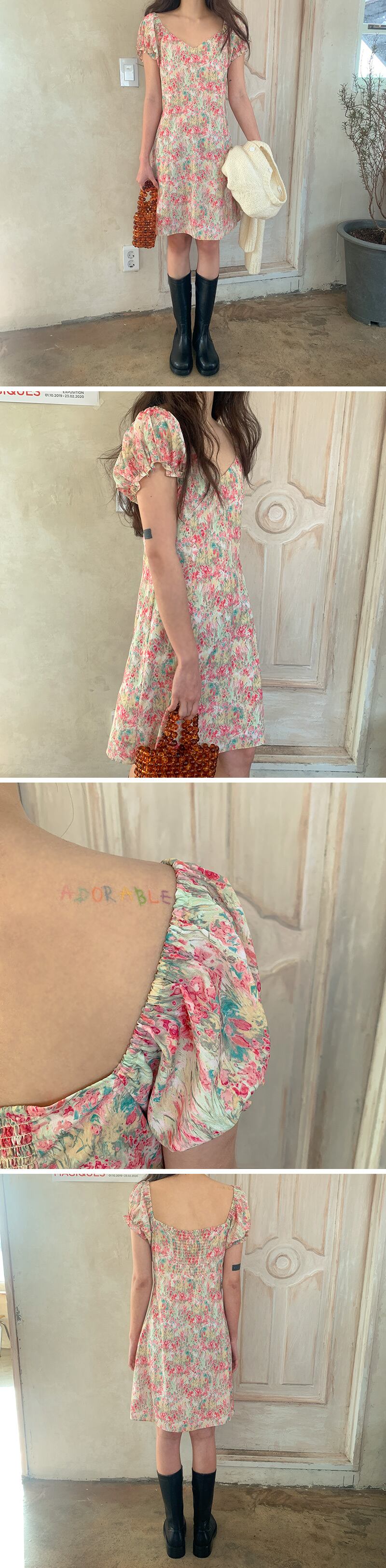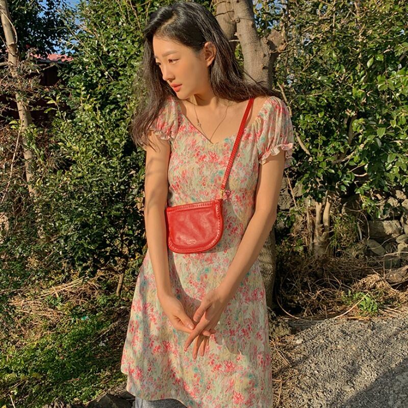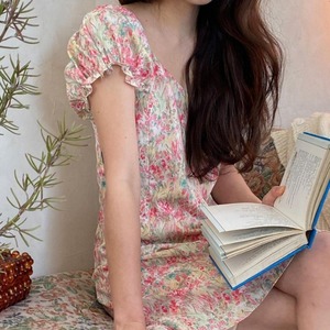 サマースタンダードカラースリーブフローラルショートドレス レトロ 大人ガーリー スウィート キュート カジュアル 夏物 花柄 スクウェア 韓国婦人8850071451