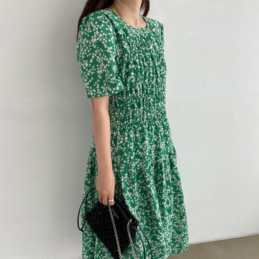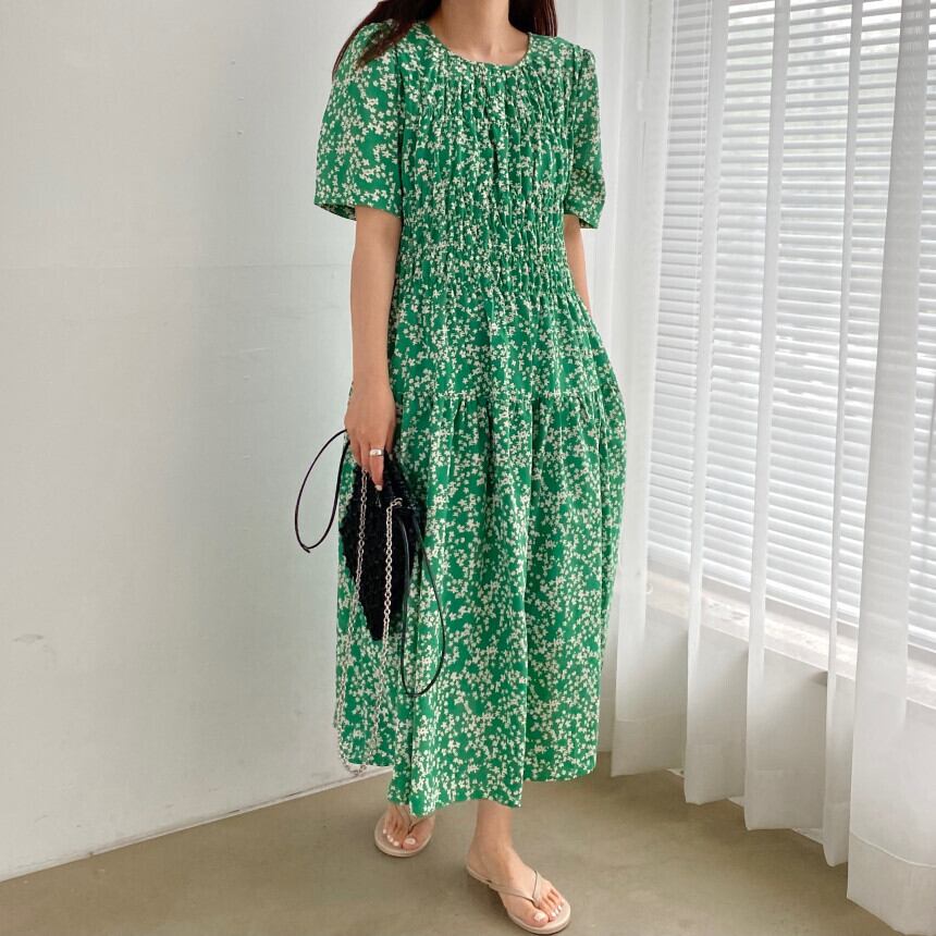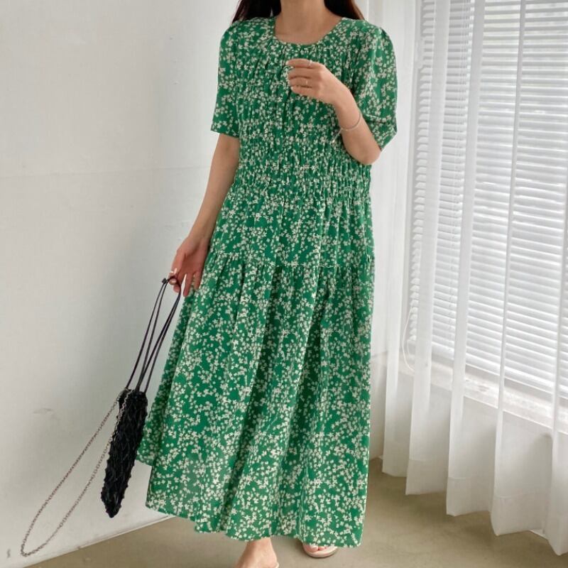 サマースタンダードフローラルラウンドネックプリーツシフォンドレス レトロ 夏物 花柄 Oネック 韓国婦人1499217262