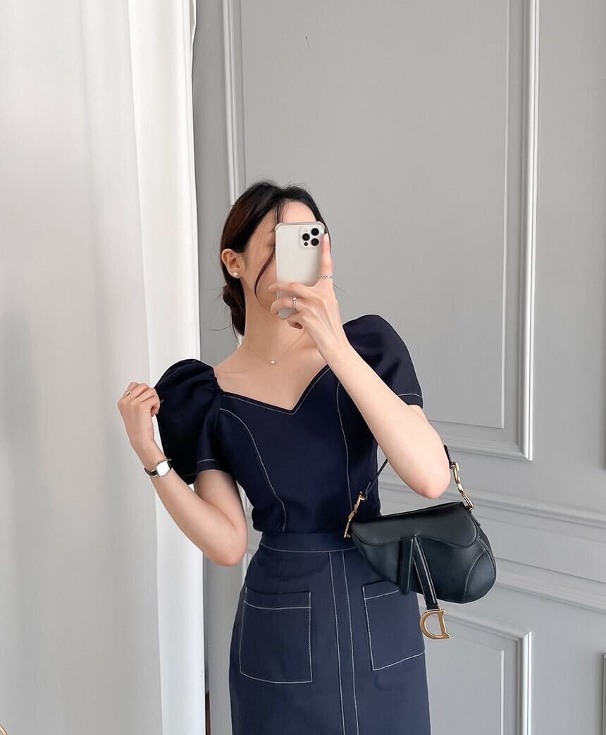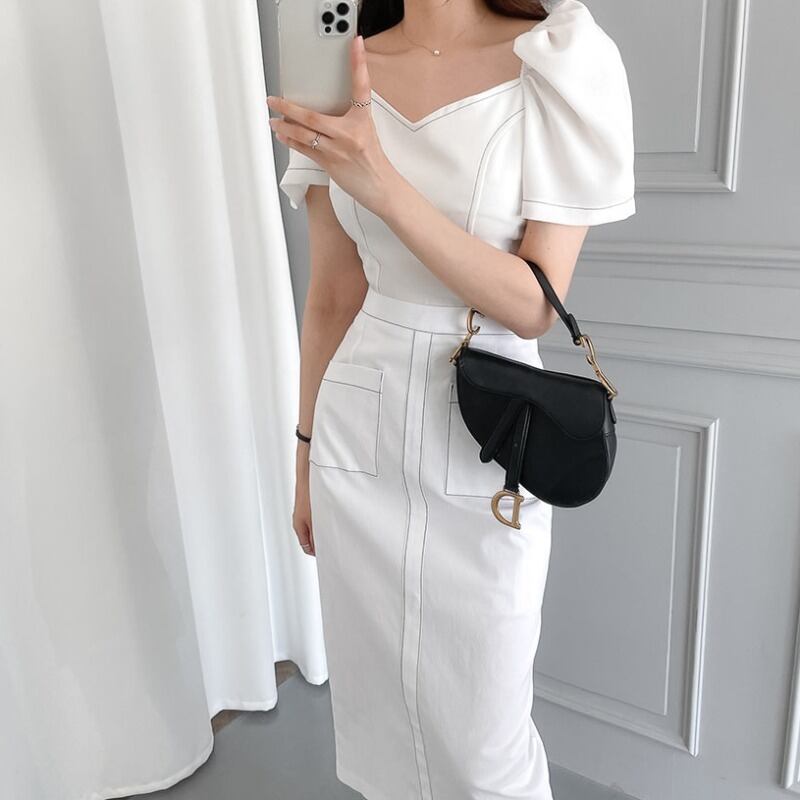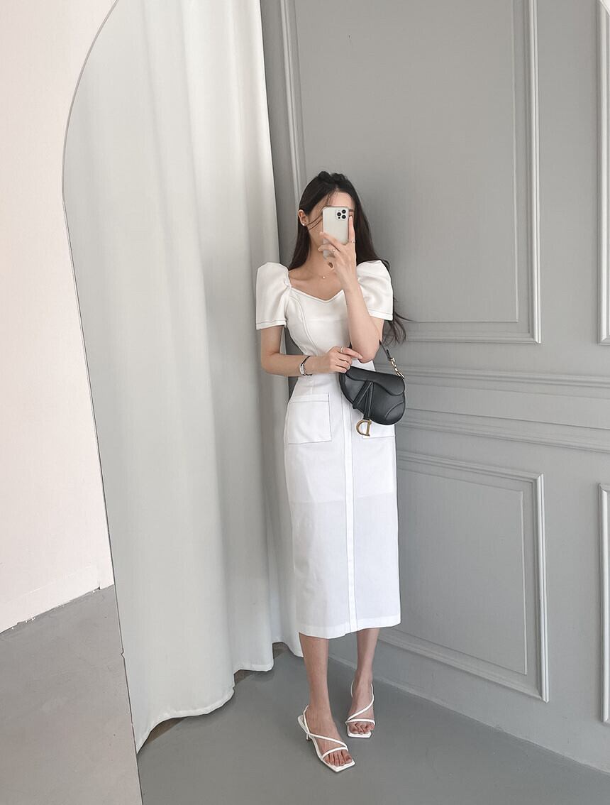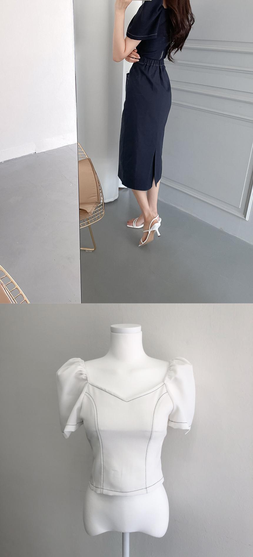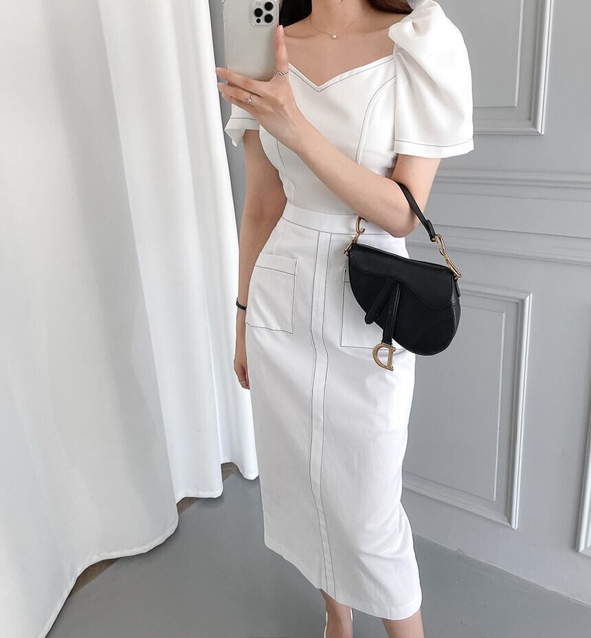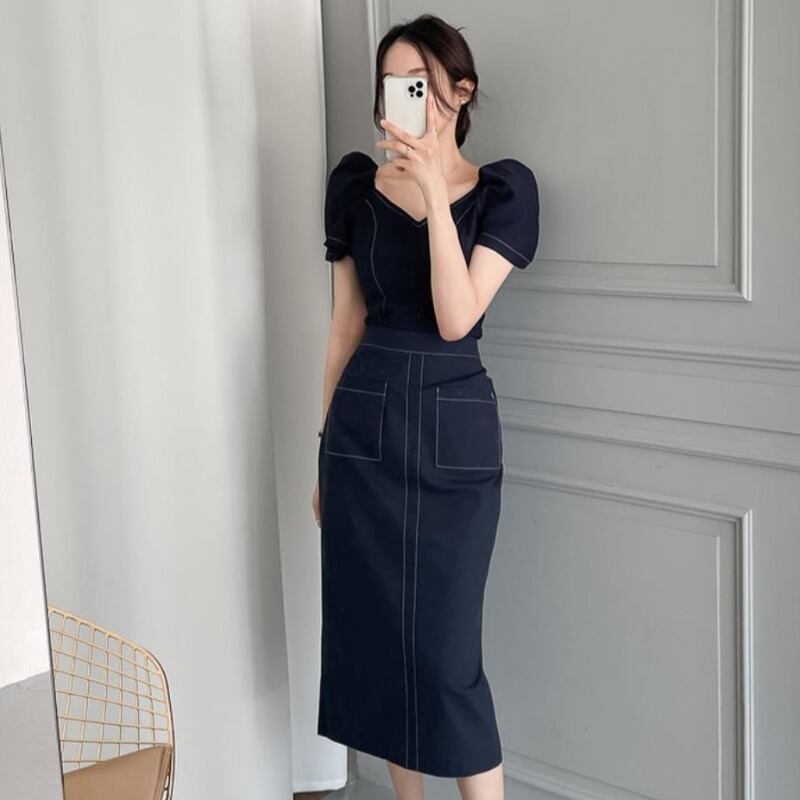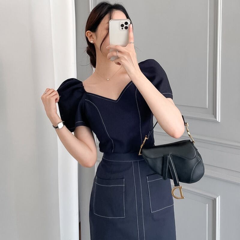 サマースタンダードラインスリーブカラーシャツ ストレッチウェストポケットスカート レトロ エラスティック 伸縮 夏物 スクウェア 韓国婦人38376156767