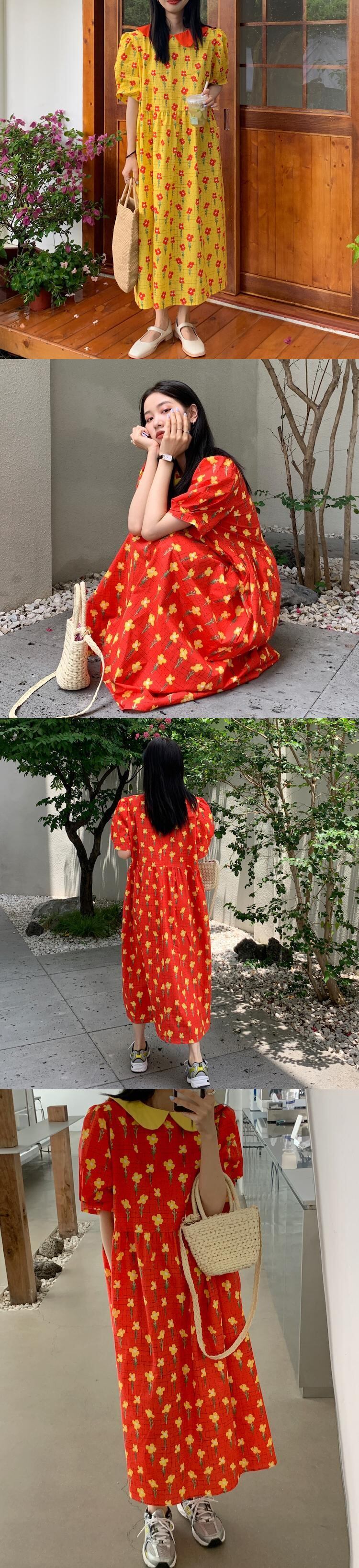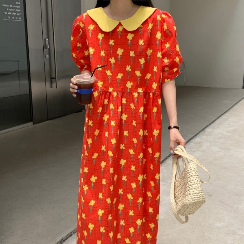 サマースタンダードカラースタイルプリント柄ルーズスリーブロングドレス レトロ 夏物 韓国婦人61175528063