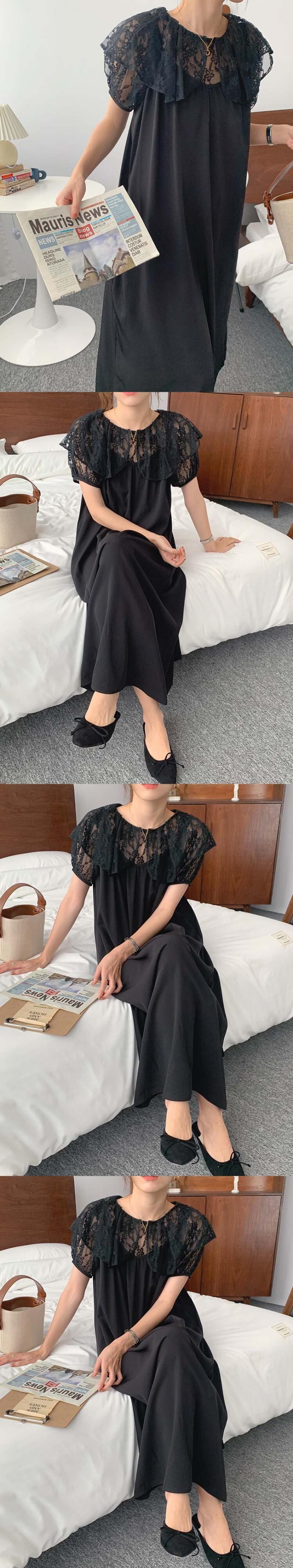 サマースタンダードスタイルカラーレースシャツ ロングドレス レトロ 夏物 韓国婦人96643018946