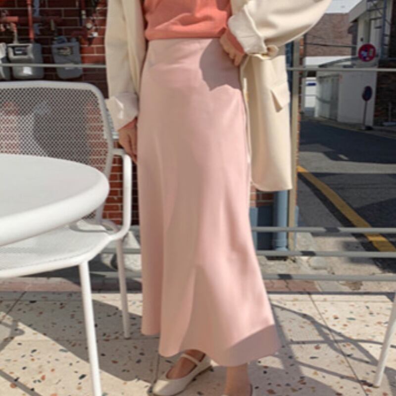 サマーハイウェストウェスト薄手カラーサテンAラインロングスカート エレガント 夏物 ピュア 韓国婦人46333435351