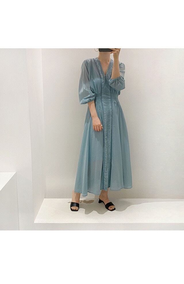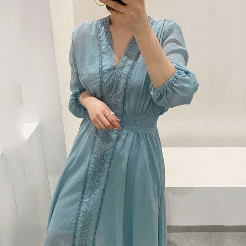 サマーレースストレッチウェストドレス ロングスカート エラスティック 伸縮 夏物 ステッチ 韓国婦人78997230628